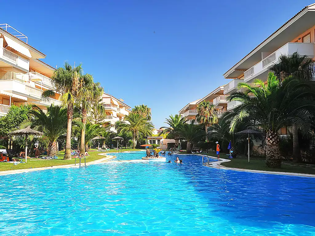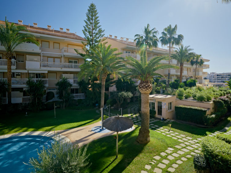 Very beautiful residence "Nou Fontana". In the district of Arenal, in a central position, 350 m from the sea, 350 m from the beach. For shared use: garden (fenced) with lawn and plants, lawn for sunbathing, swimming pool kidney-shaped (20 x 40 m, depth 40 - 210 cm, seasonal availability: 01.Jan. - 31.Dec.) with internal staircase. Children's pool, outdoor shower. In the house: restaurant, lift. Communal covered parking. Parking space or garage only for small to medium-sized cars. Shop 100 m, supermarket 550 m, restaurant 50 m, café 220 m, bus stop "Parador de Javea" 700 m, sandy beach "Arenal" 450 m. Surf school, sailing school 200 m, tennis 450 m. The owner does not accept any youth groups. Please note: Additional accommodations can be booked.4-room apartment 115 m2 on 1st floor. Practical furnishings: living/dining room with digital TV and DVD. Exit to the terrace. 1 double bedroom. Exit to the terrace. 1 double bedroom with bath/bidet/WC. 1 children's room with 1 x 2 bunk beds (80 cm). Kitchen (oven, dishwasher, microwave, freezer). Shower/bidet/WC. Air-conditioning, forced-air heating. Terrace 28 m2. Terrace furniture. View of the swimming pool. Facilities: washing machine. Internet (WiFi, free). Garage space n 19. AT-424390-A // Reg. Nr.: ESFCTU00000307100048555200000000000000000AT-424390-A4