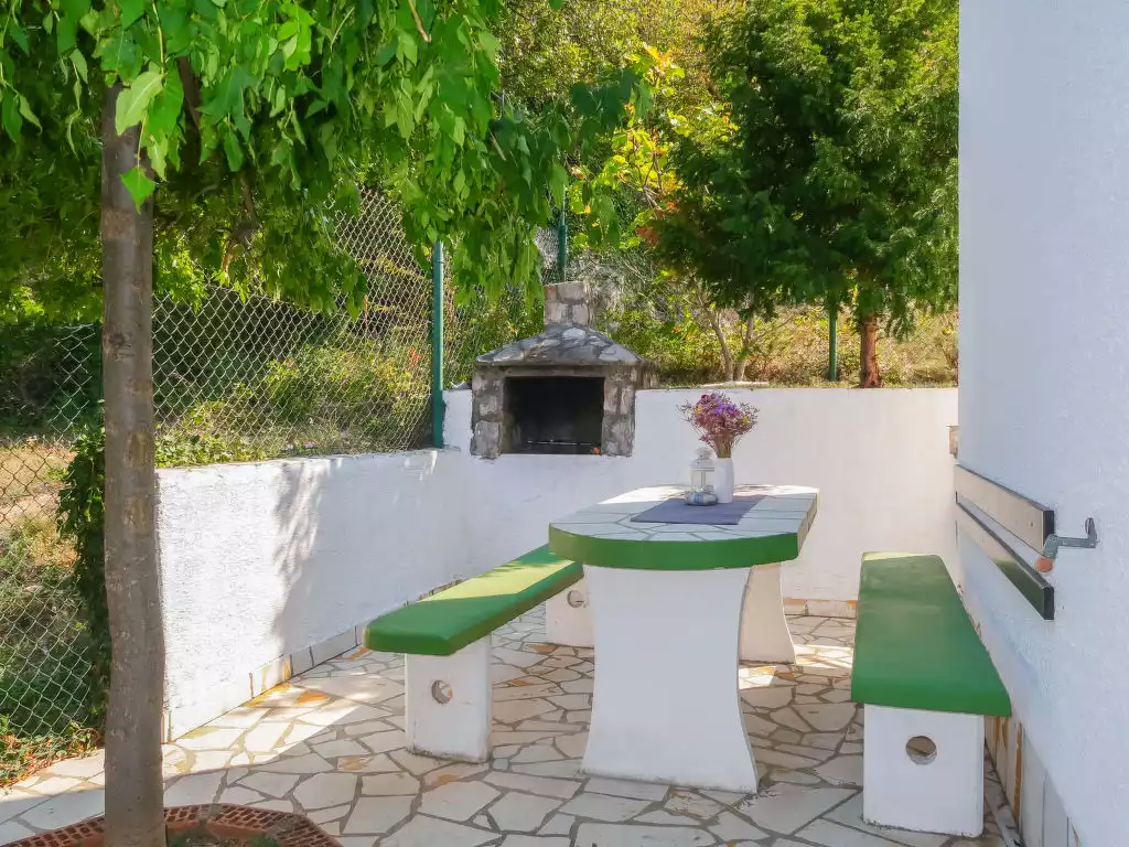 Sveti Juraj: 3-family house "Novak". 8 km from the centre of Senj, 24 km from the centre of Klenovica, 500 m from the sea, 500 m from the beach, in a cul-de-sac. For shared use: property 400 m2 with plants and trees. In the house: internet access, washing machine (for shared use, extra). Parking on the premises. Shop, restaurant, bus stop, pebble beach 500 m."Novak", 3-room apartment 50 m2 on 1st floor. Living/dining room with 1 sofabed, satellite TV and air conditioning. Exit to the balcony. 1 room with 2 beds (90 cm, length 200 cm). 1 room with 1 french bed (180 cm, length 200 cm). Open kitchen (2 hot plates, toaster, kettle, microwave, freezer, electric coffee machine). Shower/WC. No heating option. Balcony 7 m2, terrace. Terrace furniture, balcony furniture, barbecue. View of the sea. Facilities: Internet (WiFi, free). Maximum 2 pets/ dogs allowed.