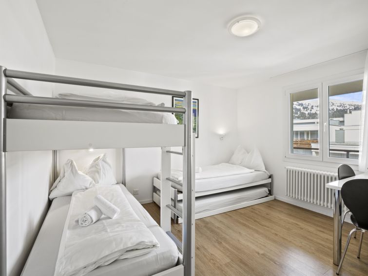 House Ladina/ 5th floor – right / Elevator / Wifi yes / 1 room with double bed / 1 room with bunk bed and single bed / 1 bathroom with WC and shower / 1 separate WC All lake street apartments house numbers 4-6 are located in the center of Lenzerheide and feature a south-facing balcony. They are directly connected to the ski slope/cross-country skiing trail and are in close proximity to the free sports bus and various shopping opportunities. A great starting point for all winter/summer activities for the whole family. (In the same House Ladina, the vacation apartments No. 58, No. 63 and No. 68 are located)