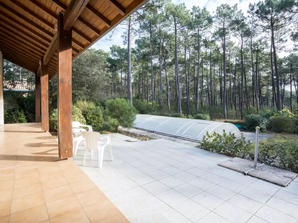 Single-family house "Orée des Greens". Outside the resort, 3.5 km from the centre, in a quiet position in the residential district, 4 km from the sea, 3 km from the lake, 4 km from the beach. Private: natural state property 1'000 m2, swimming pool, indoor pool (4 x 8 m, depth 50 - 190 cm, seasonal availability: 01.Jun. - 30.Sep.). Parking on the premises. Shop 3.5 km, supermarket 4 km, restaurant 3.5 km, bicycle rental 3.5 km, bus stop "Le Huga" 1 km. Golf course (18 hole) 1.2 km, surf school 4 km, tennis 2.9 km, minigolf 3.5 km, cycle lane 1 km. Nearby attractions: Parcours Aventure 4 km. Well-known lakes can easily be reached: Lac de Lacanau 3 km. Groups of teenagers on request only.4-room house 120 m2 on 2 levels, south facing position. Living/dining room with TV. Exit to the terrace. 1 room with 1 french bed (140 cm, length 190 cm). 2 rooms, each room with 2 beds (90 cm, length 190 cm). Open kitchen (oven, dishwasher, 3 induction hot plates, microwave, electric coffee machine) with bar. Bath/shower, sep. WC. Heating. Upper floor: gallery with 1 double sofabed. Terrace, south facing position. Terrace furniture. Facilities: washing machine. Internet (WiFi, free). Please note: non-smokers only. Smoke alarm. Due to water restrictions implemented in response to drought conditions in certain regions of France, please be aware that the swimming pool may remain closed until the legal restrictions allowing the filling and replenishment of water in private swimming pools and ponds are lifted. For official information on measures to limit or suspend water usage in France, please refer to Propluvia - Accueil (developpement-durable.gouv.fr). Instead of an enclosed bedroom, some sleeping areas are located in an open-plan area (gallery, alcove, etc.).