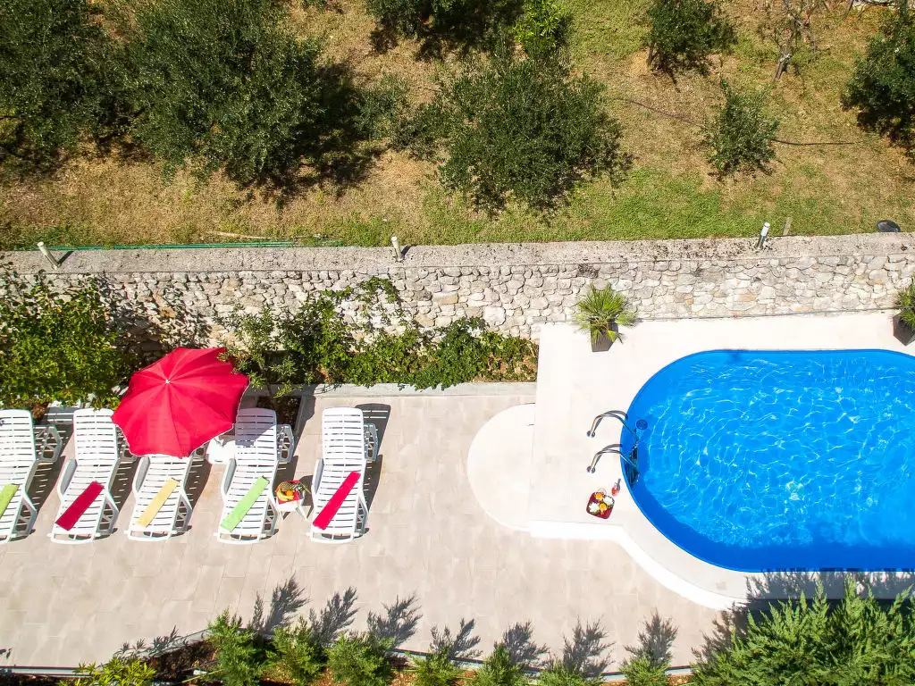 Terraced house "Oscha". 3 km from the centre of Lovran, on the outskirts, 800 m from the centre of Medveja, 5 km from the centre of Opatija, in a secluded position, 800 m from the sea, 800 m from the beach. For shared use: property 1'000 m2 (fenced) with lawn and plants, swimming pool (6 x 3 m, depth 150 cm, seasonal availability: 01.May. - 02.Oct.). Outdoor shower, barbecue. In the house: internet access. Motor access to the house (100 m via unmade road). Parking at the house on the premises. Supermarket 800 m, bus stop 950 m, pebble beach 800 m. Marina 5 km. The owner does not accept any youth groups. Please note: the owner lives on the same property. Airfield 50 km from the property. Access to the rental by car via Camp Medveja."Oscha", 2-room apartment 40 m2, on the upper ground floor. Walk-through room with 1 french bed (160 cm, length 200 cm), air conditioning. 1 room with 1 french bed (140 cm, length 200 cm). Kitchen (4 hot plates, oven, dishwasher, toaster, kettle, microwave, electric coffee machine) with open-hearth fireplace and dining table. Exit to the terrace. Shower/WC. No heating option. Terrace 40 m2. Terrace furniture, deck chairs (2). Facilities: Internet (WiFi, free). Please note: non-smoking house. Private entrance.