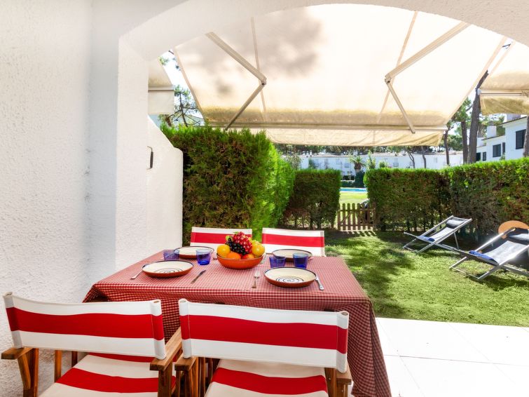 Golf Playa De pals 6 km from Pals Centro: Terraced house "Pals Haus", 2 storeys. 1 km from the sea, 1 km from the beach. For shared use: natural state property, garden, swimming pool (14 x 6 m, depth 100 - 200 cm, seasonal availability: 01.Jan. - 31.Dec.). Private: natural state property, parking. Supermarket 1.5 km, restaurant 1 km, bar 200 m, bus stop 7 km, sandy beach "Playa de Pals" 1 km. Golf course (18 hole) 500 m. Nearby attractions: Illes Medes 17 km. The owner does not accept any groups. The owner does not accept any youth groups. Neighbourhood highly sensitive to noise. Quietness and good behaviour expected."Pals Haus Venice", 4-room terraced house 85 m2. Practical furnishings: living/dining room with digital TV. Exit to the patio. Kitchen (oven, dishwasher, 4 ceramic glass hob hotplates, toaster, microwave, freezer, electric coffee machine) with hatch. No heating option. Upper floor: 1 room with 1 pull-out bed (2 pers. 2 x 90 cm, length 190 cm). 1 room with 2 beds (90 cm, length 190 cm). Exit to the balcony. 1 room with 1 french bed (180 cm, length 190 cm). Bath/WC, shower/WC. Boiler (100 litres). Patio. Terrace furniture. Facilities: washing machine, iron, children's high chair, baby cot, hair dryer. Internet (WiFi, free). Parking space n A 40. Please note: TV only ES. HUTG-074333 // Reg. Nr.: ESFCTU00001700700023088800000000000000000HUTG-0743335