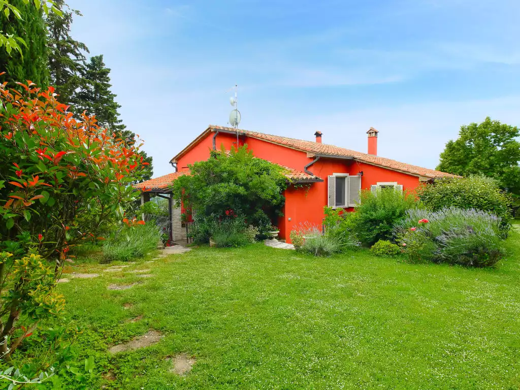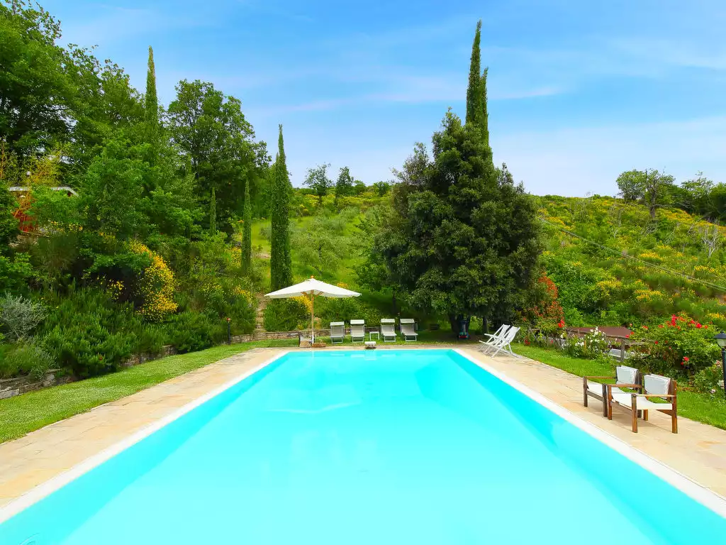 Situated at the top of a beautiful hill in the heart of Umbria, well connected to the main service centers, this house has an incomparable view of the valley. Ideal for relaxing holiday and with beautiful nature, without lacking of any kind of comfort. Villa " Paradiso", 330 m a.s.l., detached, surrounded by trees, meadows and fields. Property composed of main house and outbuilding 24 km from the centre of Perugia, in a secluded, sunny, elevated position, 36 km from the lake. Private: property 3 ha, wildlife garden and flowers, beautiful garden to relax, swimming pool (6 x 14 m, depth 120 - 250 cm, seasonal availability: 01.May. - 30.Sep.). Outdoor shower, garden furniture, barbecue, pool maintenance by the owner/gardener. In the house: WiFi. Parking at the house. E-charging station. Grocery 5 km, restaurant 5 km, bar 4 km, thermal baths "Terme Francescane" 40 km, bathing lake "Trasimeno" 36 km. Golf course (18 hole) 12 km, riding stable 7 km. Nearby attractions: Gubbio 35 km, Città di Castello 40 km, Assisi 40 km, Passignao sul Trasimeno 40 km, Arezzo 75 km. Please note: car recommended. Groups of teenagers on request only. Inside the park under the pergola there is a barbecue area with a refrigerator, wood oven, oven, gas stove and a large dining table. According to the season it is possible to taste the vegetable garden products." Paradiso", 7-room villa 300 m2 on 2 levels, on the ground floor. Very beautiful and tasteful furnishings: entrance hall with tiled stove. Exit to the garden. Large living/dining room with open-hearth fireplace, TV, flat screen and heating stove. Exit to the garden. Living/sleeping room with 1 x 2 bunk beds, 1 double bed, kitchen corner, bath/bidet/WC, heating stove and air conditioning. Exit to the garden. Kitchen-/living room (5 hot plates, oven, dishwasher, microwave, freezer) with open-hearth fireplace, dining table and TV (flat screen), wood-burning stove. Exit to the loggia. Shower/bidet/WC. Upper floor: large living/dining room with open-hearth fireplace, TV and flat screen. 1 double bedroom with shower/bidet/WC, TV, flat screen and air conditioning. Exit to the garden. 1 double bedroom with Dressing room. 1 room with 2 beds, TV, flat screen and air conditioning. Exit to the garden. Bath/bidet/WC, hydro massage bath. Wood heating, solar energy heating. Wooden floors, natural stone floors. Panoramic view of the valley. Facilities: washing machine, mosquito net, hair dryer. Internet (WiFi). E-charging station. 1 small pet/ dog allowed. The living room with double bed on the mezzanine, bunk beds, kitchenette and bathroom, is located in the beautiful and welcoming annex situated in the garden just a few metres from the swimming pool. In case the house is booked for six people, the annex will be excluded from the rent. Smart TV available in the main House. When there are less than the maximum number of guests staying at the property, the annex will not be available for use. IT054039C204033329