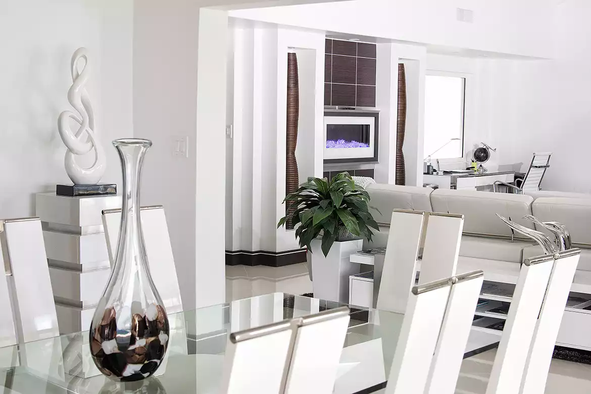 Paradiso is truly a gem of a villa. The minute you walk through the magnificent front doors, the astounding panoramic views of Dawn Beach, Oyster Pond and the gleaming Atlantic Ocean beyond will greet you. The pristine and contemporary decor of the living/dining room areas accent this wonderful view with the bright white furnishings and glass table tops complimented by exclusive artwork and sculptures.