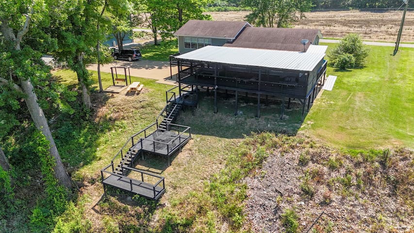 Screened Patio Addition just complete! Enjoy 45 ft by 20 ft of screened patio no matter the weather. You can see down the Tennessee River for miles. Watch boats and barges surf the waters surface. Walk down the walkway to the first platform for an additional 12 ft by 12 ft space that includes seating for 6. Down another set of steps to a pier where you can fish in our canal. We have a boat ramp just a few homes down with access to the Tennessee River!