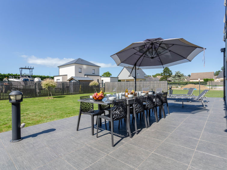 Modern single-family house "Pirou Beach", built in 2018. 4 km from the centre of Pirou-Plage, 6 km from the centre of Créances, 18 km from the centre of Coutances, residential area (villas), 350 m from the sea, in a cul-de-sac. Private: property 1'000 m2 (fenced) with lawn. In the house: storage room for bicycles. Parking (for 3 cars) on the premises. Shop 1 km, supermarket 6 km, restaurant 1 km, bus stop "Rond-point de la Lande" 10 km, sandy beach 350 m. No access to the balcony."Pirou Beach", 6-room house 166 m2 on 2 levels. Bright, modern and tasteful furnishings: living/dining room with dining table, TV and DVD. Exit to the terrace. 1 room with 2 beds, hand-basin, separate WC and shower. Exit to the garden. Open kitchen (oven, dishwasher, 3 induction hot plates, toaster, kettle, microwave, freezer, electric coffee machine). Exit to the terrace. Sep. WC. Upper floor: 1 room with 2 beds. 3 rooms, each room with 1 french bed (160 cm). Shower, sep. WC, double hand-basin. Electric heating. Terrace. Terrace furniture, barbecue (portable), deck chairs (8), box-room. Facilities: washing machine, iron, children's high chair, baby cot. Internet (WiFi, free). Please note: non-smoking house. Maximum 2 pets/ dogs allowed. When there are less than the maximum number of guests staying at the property, not all of the bedrooms will be available for use.