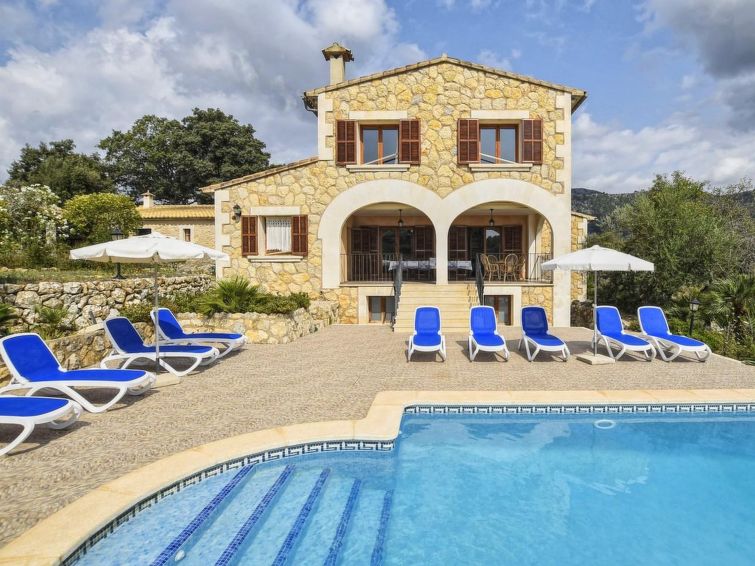 Campanet: Large, rustic, comfortable house "Pla de Ses Rotes", built in 2008, surrounded by trees and fields. In the resort Campanet, in a quiet position, 18 km from the sea, in the countryside. Private: lawn for sunbathing 2'000 m2, beautiful garden to relax, swimming pool angular (10 x 5 m, seasonal availability: 01.Mar. - 30.Oct.). Outdoor shower, patio, pergola, garden furniture, barbecue. In the house: internet access, WiFi, air conditioning, washing machine. Parking on the premises. Shop 1.3 km, grocery 1.3 km, supermarket 1.3 km, restaurant 1.3 km, bus stop 450 m, sandy beach 18 km. Please note: car recommended. Suitable for families, suitable for seniors baby equipment on request (included). Object suitable for 11 adults. The owner does not accept any youth groups. Loading and unloading of baggage is possible at the holiday house. Airfield 45 km from the property."Pla De Ses Rotes", 6-room house 280 m2 on 2 levels. Object suitable for 10 adults. Comfortable and cosy furnishings: large living room with dining nook, satellite TV and flat screen. 1 double bedroom with 2 beds (90 cm, length 200 cm). 1 double bedroom with 2 beds (90 cm, length 200 cm). 1 double bedroom with 2 beds (90 cm, length 200 cm). 1 double bedroom with 1 french bed (150 cm, length 200 cm). 1 double bedroom with 1 french bed (150 cm, length 200 cm). Kitchen (oven, dishwasher, 3 induction hot plates, toaster, microwave, freezer, electric coffee machine). Bathroom, bath/WC, shower/WC, sep. WC, bath/shower/WC. Patio 200 m2. Terrace furniture, barbecue, covered balcony. View of the sea, the mountains, the swimming pool, the garden and the countryside. Facilities: washing machine, iron, children's high chair, baby cot for up to 2 year olds, hair dryer. Internet (WiFi, free). Suitable for families. 2949 // Reg. Nr.: ESFCTU00000702200030943600000000000000000000ETV/29498