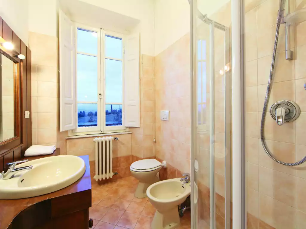 Villa "Poggio Patrignone", built in 1915. 10 km from the centre of Arezzo, 30 km from the centre of Cortona, Sansepolcro, 70 km from the centre of Firenze, Siena. Private: property, garden (fenced), swimming pool (12 x 15 m, depth 150 - 300 cm, seasonal availability: 08.May. - 25.Sep. and 07.May. - 24.Sep.). Pool house, tennis, floodlit, garden furniture, barbecue. In the house: with TV, billiard table, washing machine. Room cleaning 3 times per week (included). House maid on request (extra). Cook on request (extra). Motor access to the house. Parking at the house. Shop 2 km, grocery 2 km, restaurant 2 km, bus stop 1 km, railway station "Arezzo" 10 km, thermal baths "Rapolano Terme" 50 km, bathing lake "Lago Trasimeno" 67 km. Golf course (13 hole) 41 km. Nearby attractions: Anghiari 24 km, Monte San Savino 28 km, Lucignano 32 km, Montepulciano 55 km. Inside the property, all fenced, under the pine forest, there are two large separated enclosures for dogs, each of 40 square meters, with separate entrances. From the house you can see the fences. Dogs are not allowed in the house. Mid-week cleaning included in the price of 09 hours so subdivision: 3h 3 times a week, Monday, Wednesday and Friday from 15.00 to 18.00. In case of stays shorter than 7 nights, midweek cleaning will be 6h: 3h twice a week.12-room villa 750 m2 on 5 levels, on the ground floor. Antique and luxurious furnishings: large living/dining room with open-hearth fireplace, dining table, satellite TV and flat screen. Large dining room with open-hearth fireplace and dining table. Exit to the garden, to the swimming pool. Office. Large kitchen (5 hot plates, oven, dishwasher, freezer). Shower/bidet/WC. On the lower ground floor: playroom. Upper floor: 1 double bedroom. Exit to the terrace. 1 double bedroom with bath/bidet/WC and hydro massage bath. 1 room with 2 beds. 1 double bedroom. Exit to the terrace. 1 room with 2 beds. 2 showers/bidet/WC. 2nd upper floor: 1 room with 2 beds and 1 french bed. 1 room with 2 beds. Shower/WC, shower/bidet/WC. Terrace, large garden, lawn. Terrace furniture, barbecue, deck chairs. Panoramic view of the countryside. Facilities: washing machine. Internet (WiFi, free). Maximum 2 pets/ dogs allowed. The villa has 3 entrances: one on the ground floor and 2 on the first floor. In the games room there is a billiard table, a card game table. Still on the ground floor there is a private consecrate chapel. Laundry room . The garden is on the first floor level and guests can dine and relax under the shade of the trees. From the 3rd floor there is access to a panoramic terrace. IT051002B4TJBHRQWA