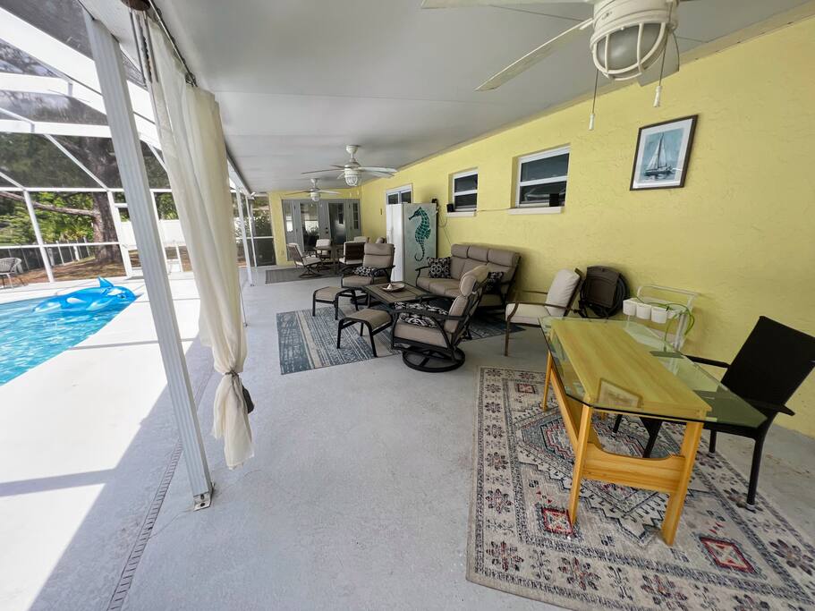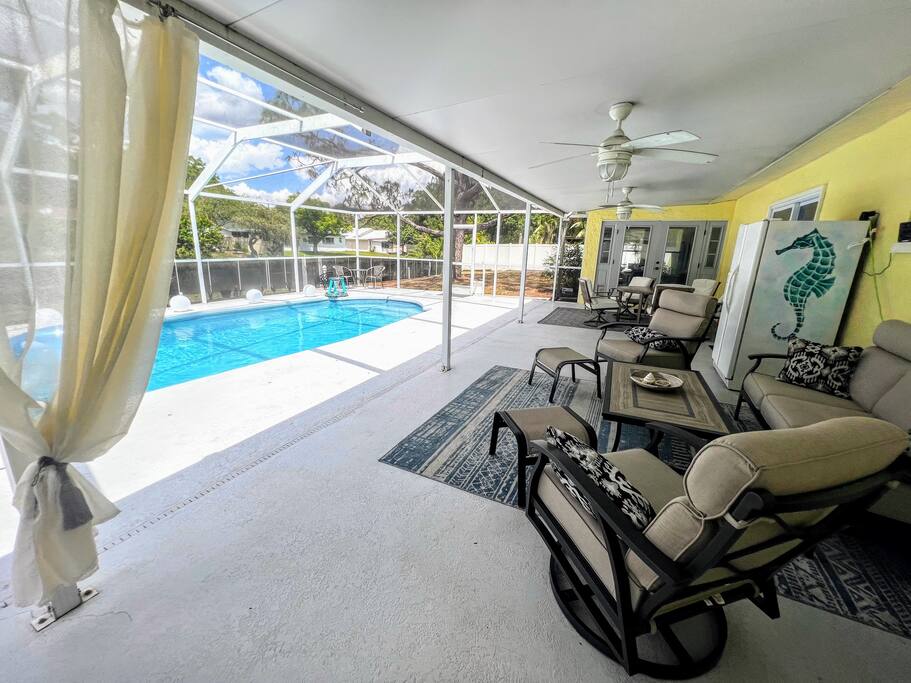 Patio area has outdoor dining area and a lounge/coffee space with extremely comfortable chairs and a sofa. And (surprise!) - no mosquitoes, so you can spend all night enjoying the ambient solar ball lights around the pool.