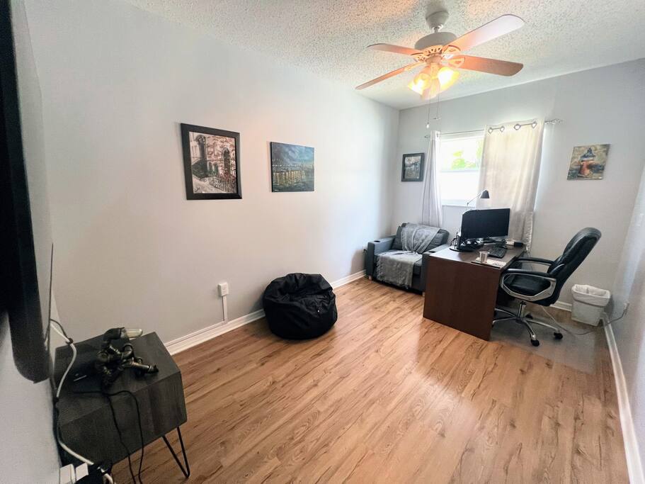 Another small bedroom with a walk-in closed, private bathroom and French door to the patio/pool area, it has an office desk and a futon convertible to a tween bed - ideal setting for someone who wants to be left alone.