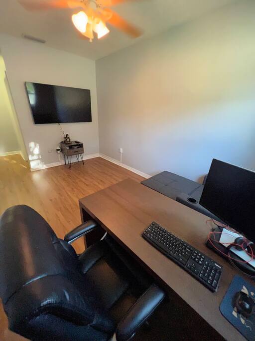 Man’s cave: you can spend your live there. Isolated office space, private bathroom, convertible chair-bed and all yours 65” TV to watch Bolts (I hate Bolts, btw).