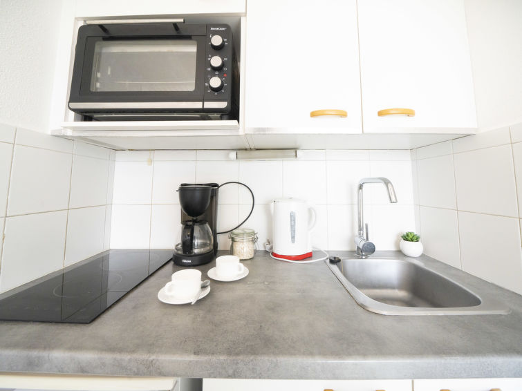 Residence "Port Athéna". In the district of La Motte du Couchant, 1.5 km from the centre of La Grande Motte, 200 m from the sea, 150 m from the beach. Public parking on the road extra. Shopping centre 100 m, restaurant, bus stop 200 m, railway station "Montpellier" 25 km, sandy beach 150 m, thermal baths "Thalasso Spa" 4 km. Sports harbour 1 km, golf course (18 hole) 4 km, sailing school 900 m, tennis 3.5 km, riding stable 2 km. Nearby attractions: Seaquarium du Grau Du Roi 10 km, Les Remparts d'Aigues Mortes 12 km, Les Saintes Maries de la Mer 40 km. Please note: airfield close by 20 km from the property.1-room apartment 21 m2 on 2nd floor. Object suitable for 2 adults + 2 children. Living/dining room with 1 double sofabed (140 cm, length 190 cm), TV (flat screen). Entrance hall with 1 x 2 bunk beds (90 cm, length 190 cm). Kitchenette (2 hot plates, toaster, kettle, microwave, electric coffee machine). Shower/WC. Terrace 6 m2, west facing position. Terrace furniture. Facilities: Internet (WiFi, extra). Please note: no parking. 1 small pet/ dog allowed. Smoke alarm. 1578967284279