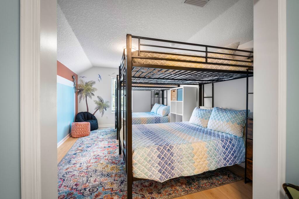 NOTE bottom bunks can hold 2 adults each HOWEVER they are Full size beds next to each other and there are no proper closets in this room