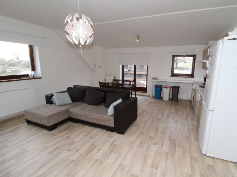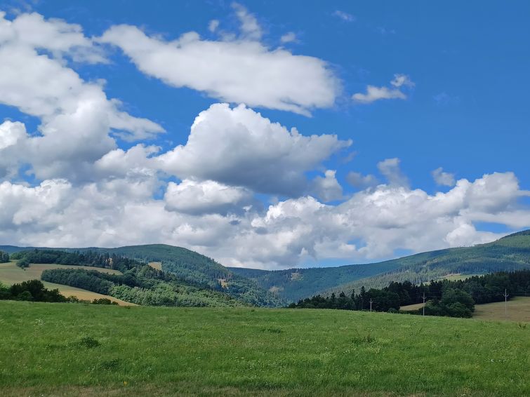 Comfortable house "Residence Čistá", detached. On the outskirts, 2 km from the centre of Černý Důl, in a quiet, sunny position, 1.5 km from the lake, 3 km from the skiing area. Private: property. Garden furniture, parking at the house, single garage. Shop 2.5 km, grocery 2.5 km, supermarket 7.5 km, restaurant 1.5 km, pub garden 100 m, bus stop "Černý Důl, Čistá, křiž." 300 m, grass beach 1.5 km (small), indoor swimming pool 19 km. Golf course (18 hole) 14 km, tennis 2.5 km, sports centre 2.5 km, walking paths from the house 100 m, cycle lane, ski lift 3 km, chair lift 3 km, slopes 3 km, ski bus stop 100 m, ski school 3 km, children's ski school 3 km, sled run 7 km, cross country ski track 100 m. Nearby attractions: Janské Lázně Spa 9 km, Vrchlabí 10 km, Aquapark Trutnov 25 km, Zoo Safari Dvůr Králové 29 km, Bozkovské jeskyně 37 km, Adršpašské skály 44 km. Well-known ski regions can easily be reached: Černý Důl 3 km, Herlíkovice 15 km, Pec pod Sněžkou 20 km, Špindlerův Mlýn 26 km. Well-known lakes can easily be reached: Čistá 1.5 km, Vrchlabí 9 km. Hiking paths: Sněžka 25 km.3-room apartment 65 m2 on 1st floor. Modern and cosy furnishings: large living room with 1 sofabed, dining table and satellite TV. 1 room with 1 double bed. 1 room with 2 x 2 bunk beds. Kitchenette (4 hot plates, oven, dishwasher, toaster, kettle, microwave, freezer, electric coffee machine). Bath/WC. Heating. Facilities: Internet (WiFi, free). Please note: suitable for families. Non-smokers only. 1 small pet/ dog allowed.