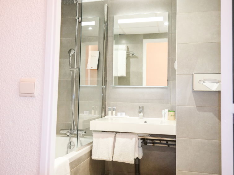 Residence "Résidence Thalazur Antibes", 4 storeys. 46 apartments in the residence. 4 km from the centre of Antibes, 14 km from the centre of Cannes, 20 km from the centre of Nice, in the residential district, 3 km from the sea. For shared use: property 17'000 m2 (fenced), 2 swimming pools kidney-shaped (18 x 12 m, seasonal availability: 01.Jan. - 31.Dec.) with salt water. Children's pool. In the complex: reception, restaurant, bar, WiFi, sauna, fitness room, massage (extra). Steam room, lift. Bread roll service and breakfast full board half board possible (extra). E-charging station. Shop 800 m, bus stop 400 m, sandy beach 4 km pebble beach 3 km. Please note: reception open 01:00-24:00 hrs. Residence with electric gates."Résidence Thalazur Antibes", 1-room apartment 28 to 33 m2. Comfortable furnishings: living/sleeping room with 1 french bed (160 cm), dining table and satellite TV. Exit to the balcony. Entrance hall with 1 bed (80 cm). Open kitchen (dishwasher, 2 ceramic glass hob hotplates, microwave, electric coffee machine). Bathroom, sep. WC. Heating, air-conditioning. Balcony. Balcony furniture. Facilities: safe, hair dryer. Internet (WiFi, free). Please note: non-smokers only. Maximum 1 small pet/ dog allowed. Offer by a commercial proprietor according to  Art. 155, IV, CGI