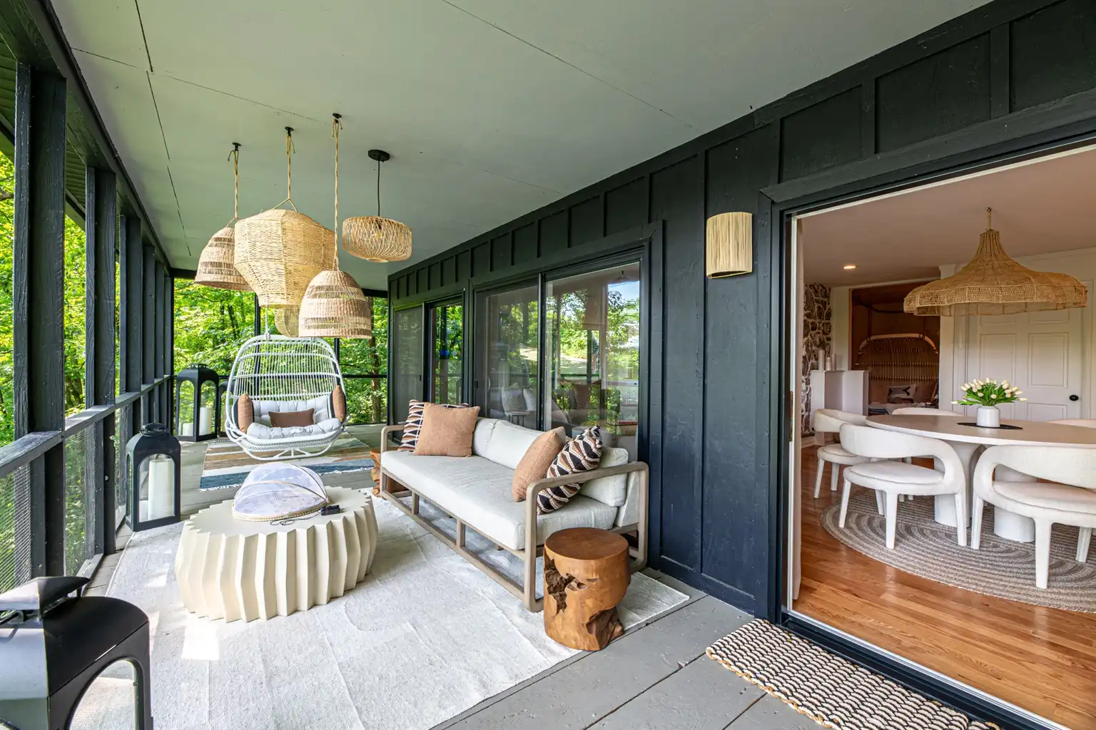 - Features several comfortable seating areas including outdoor couch, hanging swing chair, and cushioned lounge chairs off the master bedroom