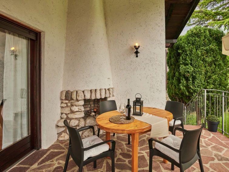 Single-family house "Rocchetta". Above Malcesine, 5 km from the centre, in an elevated position on a slope, residential area (villas), 5 km from the lake, 5 km from the beach, in the countryside. Private: beautiful, well-kept garden (fenced) lawn and trees, roofed, parking at the house. Supermarket 5 km, bus stop 1.6 km, railway station "Rovereto" 36 km, ferry "Malcesine" 5.5 km, pebble beach "Malcesine" 5 km. Cable car 4.5 km. Nearby attractions: Funivia Malcesine - Monte Baldo 4.5 km, Riva del Garda 23 km, Garda 30 km, Trento 62 km. Hiking paths: Monte Baldo 11 km. Please note: car recommended. Residence with electric gates. The owner lives on the same property.3-room house 55 m2, on the upper ground floor. Rustic furnishings: living/sleeping room with 1 sofabed, dining table and satellite TV. Exit to the terrace. 1 double bedroom with satellite TV. 1 room with 1 x 2 bunk beds. Small kitchen (4 induction hot plates, toaster, kettle, electric coffee machine). Shower/bidet/WC. Oil heating (extra). Terrace roofed. Terrace furniture, deck chairs (2). Distant view of the lake. Facilities: mosquito net. Internet (WiFi, free). Parking (roofed, fenced 1 car) at the house. Please note: non-smokers only. No mandatory extra charges to be paid on-site except for local tax. IT023045C2DVQD3CJ7