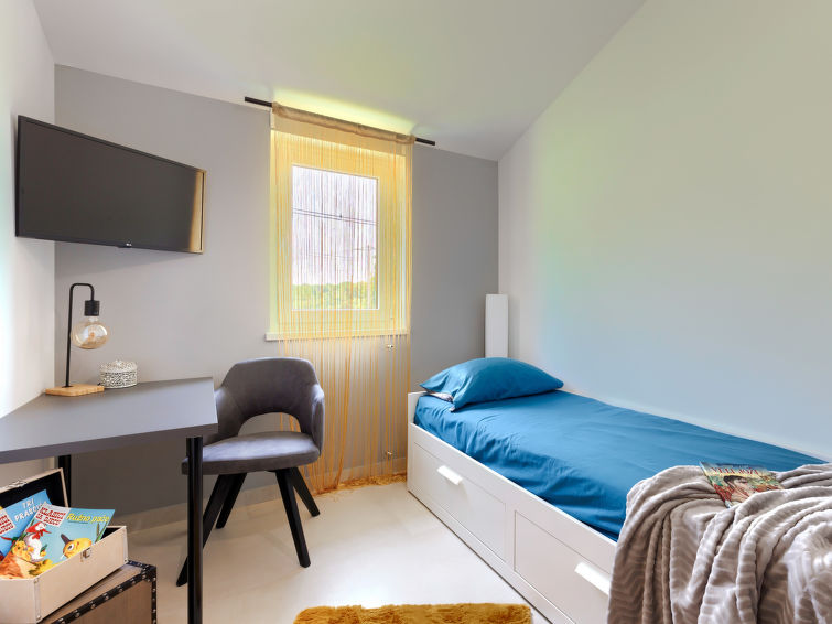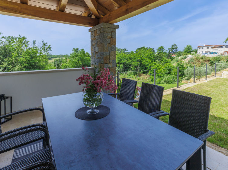 Karojba 4 km from Motovun: Very beautiful semi-detached house "Rokvilla", 2 storeys. In the hamlet Krizmani 4 km from the centre of Karojbe, in a sunny position, 20 km from the sea. Private: property 800 m2, garden with lawn, swimming pool angular (51 m2, depth 138 cm, seasonal availability: 01.May. - 15.Oct.) with internal staircase and salt-electrolysis pool-cleaning system. Outdoor shower, table tennis, terrace (10 m2), garden furniture, barbecue, pool maintenance by the owner/gardener. In the house: internet access, washing machine. Parking (for 2 cars) at the house on the premises. Shop 3 km, restaurant 4 km, bus stop 6.3 km, pebble beach 25 km, rocky beach 20 km. Please note: suitable for families. The owner does not accept any youth groups.4-room semi-detached house 103 m2 on 2 levels. Very beautiful furnishings: entrance hall. Upper floor: living/dining room with satellite TV (flat screen), air conditioning. Exit to the terrace. 1 room with 1 french bed (180 cm, length 200 cm), satellite TV (flat screen), air conditioning. 1 room with 2 beds (90 cm, length 200 cm), satellite TV (flat screen), air conditioning. 1 children's room with 1 pull-out bed (2 pers. 2 x 80 cm, length 200 cm), satellite TV (flat screen), air conditioning. Open kitchen (oven, dishwasher, 4 induction hot plates, toaster, kettle, microwave, electric coffee machine). 2 showers/WC. Electric heating. Terrace 17 m2. Terrace furniture, deck chairs. Facilities: safe, iron, baby cot, hair dryer. Internet (WiFi, free).