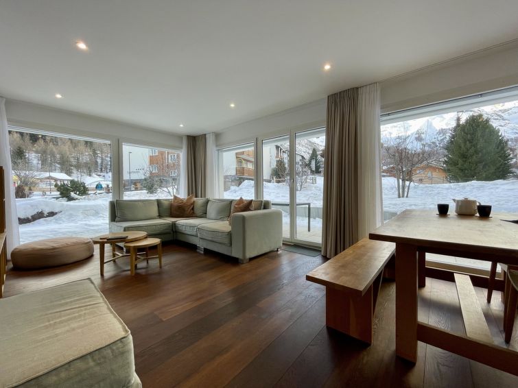 House Romaine is a modern, light and tastefully furnished apartment for up to 4 people close to the cable car and slopes. Located on the ground floor (90m2), with a large terrace with panoramic views. Featuring a master bedroom with 4-layer all natural COCO-MAT bed (180 x 220 cm) and a twin bedroom with two 2-layer COCO-MAT beds (90 x 200 cm) that can be connected to each other. The apartment provides a bath/wc and a shower/wc, both with sink and hairdryer. Organic cotton bed linen and towels are provided. Open plan area with kitchen, dining area and living room with Sonos sound system and a smart flatscreen TV you can use your own streaming services on. Free WiFi all through the apartment. The kitchen is fully equipped with dishwasher, oven, stove, Nespresso machine, toaster, kettle, cheese fondue set and raclette oven. The apartment benefits from large windows and panoramic views in all rooms. The large terrace is equipped with a garden table, comfortable chairs as well as two lounge chairs. There is also a shielded area for bikes. The Alpin Express cable car is within 100 meters walking distance of House Romaine. Your own private ski storage facility with boot dryer is within the building: no need to rent one at the slopes. Laundry room with washer and dryer is also available in the building. House Romaine EG is completely furnished with handcrafted all natural COCO-MAT furniture and warmed with geothermal heat. It is equipped to rent out for maximum 4 persons, is non-smoking and no pets are permitted.