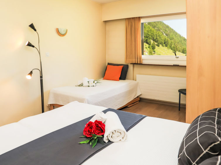 Large resort "Rosablanche", 8 storeys, built in 1972. 10 m from the skiing area. For shared use: lawn for sunbathing, pond. Tennis (01.Jul. - 15.Sep.), basketball, children's playground. In the complex: restaurant, lift, storage room for skis, central heating system, washing machine (extra), tumble dryer (for shared use, extra). Motor access to the house. Parking (limited number of spaces) at the house, public parking 100 m extra. Shop 10 m, bus stop "Haute-Nendaz, station/poste" 7.7 km, railway station "Sion" 20.5 km. Golf course (18 hole) 25 km, tennis 7 km, skisport facilities 10 m, ski bus stop 100 m, ski school, children's ski school 10 m, ski-kindergarten 7 km, sled run 100 m, ice rink 7 km, children's playground 10 m. Well-known ski regions can easily be reached: 4 Vallées 10 m. Hiking paths: Barrage de Cleuson 5 km, Bisse de Chervé 5 km, Bisse de Saxon 200 m. Please note: Additional accommodations can be booked. Sports shop / ski rental. Heating in winter only. A cash deposit is requested for the key of the parking gate and the parking card (CHF 200.- or EUR 200.-). If you are leaving early morning, you may collect your deposit the evening before departure and will have to pay the parking for the last night."Rosablanche C54", 2-room apartment 60 m2 on 5th floor. Comfortable furnishings: living/dining room with 2 sofabeds (80 cm, length 200 cm), cable TV. 1 room with 1 bed (90 cm, length 190 cm), 1 pull-out bed (2 pers. 2 x 90 cm, length 190 cm). Kitchenette (dishwasher, 4 ceramic glass hob hotplates, toaster, kettle, electric coffee machine, Capsules for coffee machine (Nespresso) extra, combination microwave, fondue Set (cheese)). 2 baths/WC. Balcony, south facing position. View of the ski run. Facilities: hair dryer. Internet (WiFi, free). Please note: non-smoking house. Lift C.