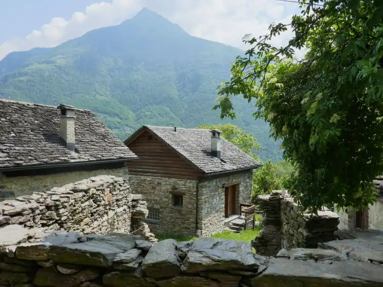 Semione 3 km from Malvaglia: Beautiful, cosy, rustic single-family house "Rustico Casa Cleo", surrounded by trees and meadows. Above Semione, in the hamlet Bü with 7 houses, in the district Valle di Blenio, in a sunny position, 10 m from the edge of the forest, in the countryside, south facing position. Private: garden. Garden furniture, barbecue. Motor access (mountain road). 30 m footpath to the house. Public parking on the road. Supermarket 5 km, restaurant 3 km, bar 3 km, bakery 5.5 km, bicycle rental 5.6 km, bus stop "Semione Municipio bus 132" 3.5 km, railway station "Biasca FFS - SBB" 9.6 km. Walking paths from the house 5 m, cable car 5.2 km. Nearby attractions: Museo della Valle di Blenio, Castelli di Bellinzona (UNESCO), Castello di Seravalle, Navone, Parco Tamaro, Splash & Spa Rivera, Ascona, Locarno, Ponte Tibetano, Monte Carasso. Well-known lakes can easily be reached: Lago di Luzzone, Lago Retico, Lago Ritom, Lago Maggiore (Locarno), Lago di Lugano. Hiking paths: Alpe di Gardosa, Capanna Püscett, Pian d'Alpe, Pizzo Matro, Val Malvaglia, Campo Blenio, Greina, Lucomagno. Please note: car recommended."Rustico Cleo", 4-room house. Partly with sloping ceilings, comfortable and rustic furnishings: open dining room with open-hearth fireplace and dining table. Exit to the garden. Open kitchen (dishwasher, 4 ceramic glass hob hotplates, toaster, kettle, microwave, electric coffee machine, Capsules for coffee machine (Nespresso) extra, raclette grill, fondue Set (chinoise, cheese)). Shower/WC. Electric heating, wood heating. On the lower ground floor: living room with satellite TV and flat screen. Upper floor: 2 double bedrooms with sloping ceilings, each room with 1 double bed (1 x 160 cm, length 200 cm). Terrace furniture, barbecue (portable), deck chairs (1), sitting area. Very beautiful view of the mountains, the valley and the countryside. Facilities: washing machine, dryer, children's high chair, baby cot for up to 2 year olds (extra), hair dryer. Please note: suitable for families. Non-smokers only. 1 small pet/ dog allowed. Fire extinguisher. NL-00006897