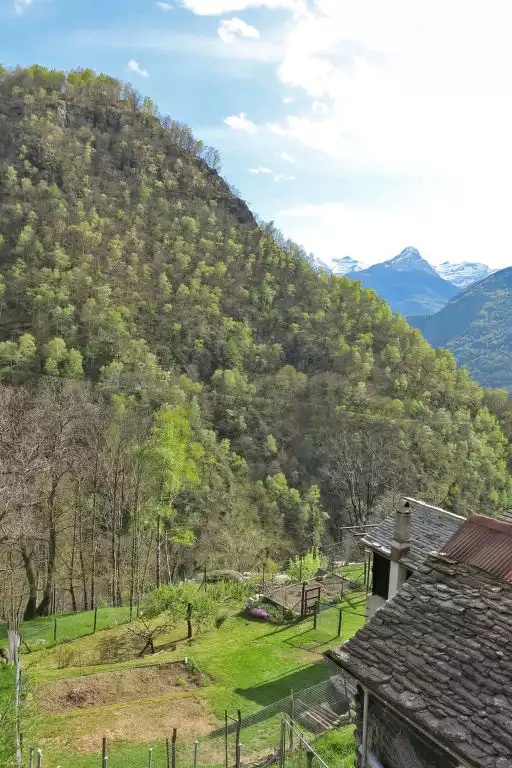 Pontei 8 km from Malvaglia: Rustic, simple single-family house "Rustico Diego", 787 m a.s.l., surrounded by trees and meadows. 8 km from the centre of Malvaglia, 14 km from the centre of Biasca, 33 km from the centre of Bellinzona, in the district Valle di Blenio, in a cul-de-sac. Private: property 50 m2, terraced garden lawn. Terrace, garden furniture. 8 km long narrow motor access (mountain road). (10 steps). Parking at the house. Supermarket 8 km, restaurant 8 km, bakery 8 km, bicycle rental 8 km, bus stop "Malvaglia Chiesa bus 131-140" 8 km, railway station "Biasca FFS - SBB" 13.5 km. Cable car 8 km. Nearby attractions: Molino di Dandrio, Castelli di Bellinzona UNESCO, Mercato di Bellinzona (sabato), Negrentino, Museo della Valle di Blenio, Archivio Donetta, Castello di Serravalle. Well-known lakes can easily be reached: Lago di Luzone, Lago Retico, Lago Ritom, Lago Maggiore, Lago di Lugano. Hiking paths: Montegreco, Capanna Quarnei, Capanna Prou, Val Malvaglia, Valle di Blenio, Lucomagno. Please note: car recommended."Rustico Diego", 2-room house 50 m2 on 2 levels, west facing position. Simple and rustic furnishings: open living/dining room with open-hearth fireplace, dining table, satellite TV and radio. Open kitchen (oven, 4 ceramic glass hob hotplates, kettle, electric coffee machine) with wood-burning stove. Shower/WC. Electric heating, wood heating. Upper floor: 1 open room with sloping ceilings with 2 double beds. Small terrace. Terrace furniture. Beautiful view of the mountains. Facilities: children's high chair, baby cot for up to 2 year olds (extra). Please note: non-smoking house. Maximum 2 pets/ dogs allowed. NL-00005423