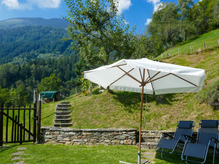 Melànico 18 km from Malvaglia: >>Note: Power is supplied by a solar panel, stove, boiler and fridge are gas-operated. Mountain road 200 m. unmade road, not recommended for cars with low ground clearance. Cosy, rustic single-family house "Rustico Girasole", 1'080 m a.s.l., surrounded by meadows. 2 km from the centre of Leontica, 19 km from the centre of Biasca, 40 km from the centre of Bellinzona, in the district Valle di Blenio, in a cul-de-sac, south-east facing position. Private: natural state property 1'000 m2 (fenced), terraced garden, meadow. Terrace, garden furniture, barbecue house. In the house: storage room for bicycles. Narrow motor access (200 m via unmade road). Parking at the house. Shop 4 km, supermarket 8.5 km, restaurant 8.5 km, bus stop "Leontica Chiesa bus 133" 1.8 km, railway station "Biasca FFS - SBB" 20 km. Nearby attractions: Castelli di Bellinzona UNESCO, Castello di Seravalle, Semione, Mercato di Bellinzona, Chiesa di Negrentino, Museo della Valle di Blenio, Archivio Doneta. Well-known lakes can easily be reached: Luzzone, Retico, Ritom, Lago di Lugano, Lago Maggiore. Hiking paths: Nara, Lucomagno, Greina, Val Malvaglia, Valle di Blenio. Please note: car recommended. Baby equipment. Animals in the neighbourhood."Rustico Girasole", 1-room cottage 55 m2 on 3 levels, south-east facing position. Simple and rustic furnishings: open living/dining room with 1 sofabed, open-hearth fireplace, satellite TV, radio and gas heater. Exit to the terrace. Open kitchen (4 hot plates, oven, Gas stove) with wood-burning stove. On the lower ground floor: shower/WC. Wood heating. Solar power. Upper floor: open gallery with 2 beds (90 cm, length 210 cm), 1 double bed (1 x 160 cm, length 210 cm). Terrace. Deck chairs (3). Very beautiful panoramic view of the mountains and the valley. Facilities: Internet (WiFi). Please note: non-smokers only. Maximum 3 pets/ dogs allowed. Fire extinguisher. Instead of an enclosed bedroom, some sleeping areas are located in an open-plan area (gallery, alcove, etc.). NL-00001922