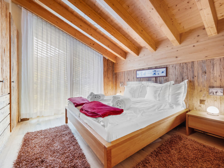 Beautiful, comfortable, luxurious chalet "Rütschi", 5 storeys, built in 2008. 7 apartments in the property. In the district of Steinmatte, 500 m from the centre, in a quiet position, south facing position. In the house: WiFi, sauna, steam room, spa area, lift, storage room for bicycles, storage room for skis, central heating system. Grocery 100 m, supermarket 550 m, restaurant, bakery 100 m, 8 minute walk to the centre, bus stop "Kirchbrücke" 100 m, railway station "Bahnhof Zermatt" 900 m. Mountain railway 700 m, ski rental 100 m, ski bus stop 150 m, ski school, children's ski school 500 m. Please note: baby equipment on request. Additional accommodations can be booked.4-room apartment 132 m2 on 2 levels on 3rd floor. Comfortable and luxurious furnishings: 1 double bedroom with 1 double bed and TV. Living/dining room with dining table, TV, radio, CD-player and DVD. Exit to the balcony, south facing position. Open kitchen (oven, dishwasher, 4 induction hot plates, toaster, kettle, freezer, electric coffee machine, Capsules for coffee machine (Nespresso) extra, raclette grill, fondue Set (cheese)). Bath/WC, hydro massage bath. On the lower ground floor: 2 double bedrooms, each room with 1 double bed and TV. Exit to the balcony, south facing position. Bath/WC, hydro massage bath. Balcony 12 m2, south facing position. Balcony furniture. View of to the Matterhorn. Facilities: safe, hair dryer. Internet (WiFi, free). Please note: non-smokers only.