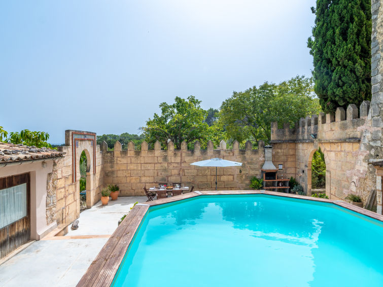 Beautiful, cosy apartment block "Sa Bisbal", renovated, surrounded by trees and fields. Outside the resort, 1.5 km from the centre of Moscari, in a quiet, sunny position, 24 km from the sea, in the countryside. Private: swimming pool (above ground) (6 x 4 m, depth 150 - 150 cm, seasonal availability: 01.Apr. - 25.Nov.). Patio, garden furniture, barbecue, pool maintenance by the owner/gardener. In the house: central heating system, heating to be paid on the spot. 700 m long bumpy, narrow motor access (mountain road). Parking at the house on the premises. Grocery 1.6 km, supermarket 7 km, restaurant 3.8 km, bar 1.5 km, bicycle rental 3.8 km, 21 minute walk to the centre, bus stop 1.6 km, sandy beach "Port d'Alcúdia" 23.4 km. Sports harbour 25 km, golf course (18 hole) 19 km, walking paths from the house 500 m, cycle lane. Nearby attractions: Moscari,Caimari,Selva,Campanet,Pollença, Ciudad de Inca 8 km, Santuari de Lluc 15 km, Port de Pollença 30 km, Palma City 42 km, Mallorca Fashion Outlet & Cinemas 28 km. Hiking paths: Serra de Tramuntana, Santa Magdalena Inca, Puig de Maria Pollença. Please note: car recommended. Object suitable for 6 adults. The owner does not accept any youth groups. Animals in the neighbourhood. Airfield 43 km from the property. Neighbourhood highly sensitive to noise. Quietness and good behaviour expected."Sa Bisbal", 5-room apartment 130 m2, on the upper ground floor. Object suitable for 4 adults. Practical and comfortable furnishings: dining room with dining table, air conditioning and forced-air heating. Large living room with digital TV, flat screen, air conditioning and forced-air heating. 1 large double bedroom with 1 double bed (180 cm, length 200 cm), hand-basin, shower/bidet/WC, air conditioning and forced-air heating. 1 double bedroom with 2 beds (90 cm, length 180 cm), fan. 1 large double bedroom with 1 french bed (180 cm, length 200 cm), hand-basin, shower/bidet/WC and fan. Kitchen (3 hot plates, oven, dishwasher, toaster, kettle, microwave, freezer, grill, electric coffee machine) with dining table. Bath/WC. Patio, porch. Terrace furniture, barbecue, deck chairs (4). Facilities: washing machine, iron, children's high chair, baby cot for up to 2 year olds, hair dryer. Internet (WiFi, free). Please note: non-smoking house. The pool mentioned in the description is for private use. ETV/9855 // Reg. Nr.: ESFCTU00000702200031242900000000000000000000ETV/98551