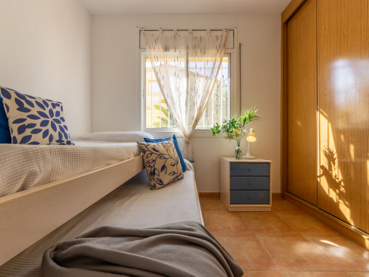 Riumar 10 km from Deltebre: Cosy, comfortable house "Sally", 2 storeys. In a quiet, sunny position, 350 m from the sea, 350 m from the beach. Private: property (fenced), swimming pool angular (7 x 3 m, depth 1 - depth 90 cm, seasonal availability: 01.Jan. - 31.Dec.) with internal staircase. Outdoor shower, pergola, terrace, garden furniture, barbecue. In the house: WiFi, air conditioning. Parking at the house, public parking on the road. Supermarket 850 m, restaurant, bar 300 m, bakery 850 m, bus stop "Riumar" 850 m, railway station "Aldea- Amposta" 25 km, sandy beach "Riumar" 300 m. Sports harbour 1 km. Nearby attractions: Parque natural Delta del Ebro 2 km, Tortosa 35 km, Playa el Trabucador 29 km, Barcelona 190 km, Port Aventura 70 km. Hiking paths: Ports Tortosa Beseit 52 km, GR 92 15 km. Please note: car recommended. Suitable for families. Groups of teenagers on request only."Sally", 5-room house 110 m2 on 2 levels. Comfortable and cosy furnishings: living/dining room with dining table, air conditioning and forced-air heating. Exit to the terrace, to the swimming pool. 1 double bedroom with 1 french bed (135 cm, length 190 cm), shower/WC. 1 double bedroom with 2 beds (90 cm, length 190 cm). 1 double bedroom with 1 pull-out bed (2 pers. 2 x 90 cm, length 190 cm). Open kitchen (oven, dishwasher, 4 ceramic glass hob hotplates, toaster, microwave, freezer, electric coffee machine) with bar. Hip bath/WC. Air-conditioning, forced-air heating. Upper floor: living/sleeping room with 1 french bed (150 cm, length 190 cm), shower/WC, digital TV, international TV channels, air conditioning and forced-air heating. Exit to the terrace. Terrace furniture, barbecue, deck chairs, covered balcony. Facilities: washing machine, iron. Internet (WiFi, free). Parking (fenced) at the house. Suitable for families. Maximum 2 pets/ dogs allowed. HUTTE001441 // Reg. Nr.: ESFCTU00004301900055041000000000000000000HUTTE0014412