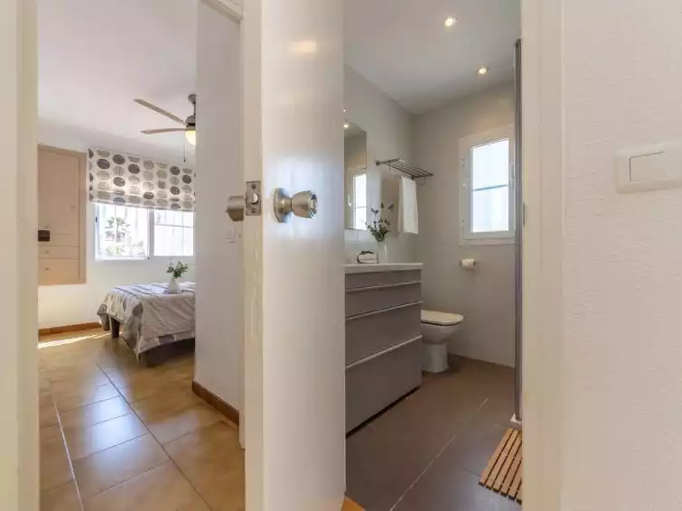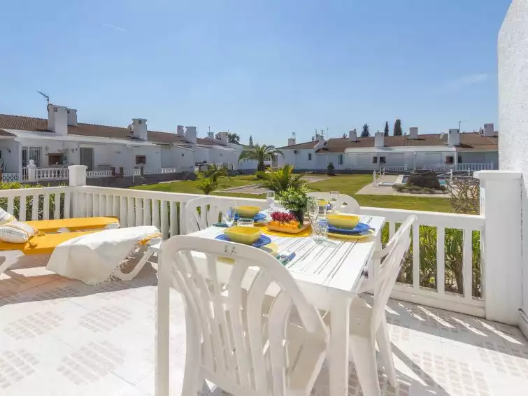 Riumar 10 km from Deltebre: Beautiful, cosy terraced house "Salvagina 6A", 2 storeys. In a quiet, sunny position, 300 m from the sea, 300 m from the beach. For shared use: large garden with lawn, swimming pool angular (25 x 12 m, depth 80 - 220 cm, seasonal availability: 01.Apr. - 31.Oct.). WC in the pool area, outdoor shower, boccia. Private: terrace, garden furniture, barbecue. In the complex: bar, internet café, WiFi. Public parking on the road. Supermarket 500 m, restaurant, bar 300 m, bakery 700 m, bus stop "Riumar" 650 m, railway station "Aldea- Amposta" 25 km, sandy beach "Riumar" 300 m. Sports harbour 1 km. Nearby attractions: Parque natural Delta del Ebro 2 km, Tortosa 35 km, Playa el Trabucador 29 km, Barcelona 190 km, Port Aventura 70 km. Hiking paths: Parque natural Puerto Tortosa Beseit 52 km, GR 92 15 km. Please note: car recommended. Suitable for families."Salvagina 6A", 4-room terraced house 71 m2 on 2 levels. Bright, comfortable and beautiful furnishings: living/dining room with dining table, digital TV, international TV channels, air conditioning and forced-air heating. Exit to the terrace. 1 double bedroom with 1 french bed (150 cm, length 190 cm). 1 double bedroom with 2 beds (90 cm, length 190 cm). Open kitchen (dishwasher, 4 ceramic glass hob hotplates, toaster, kettle, microwave, freezer, electric coffee machine). Shower/bidet/WC. Air-conditioning, forced-air heating. Upper floor: (steep stair), 1 double bedroom with sloping ceilings with 1 french bed (135 cm, length 190 cm). Terrace furniture, barbecue, deck chairs (2). View of the swimming pool and the garden. Facilities: washing machine, iron, mosquito net, hair dryer. Internet (WiFi, free). Suitable for families. 2 small pets/ dogs allowed. HUTTE-075530-10 // Reg. Nr.: ESFCTU00004301900013191600000000000000HUTTE-075530106