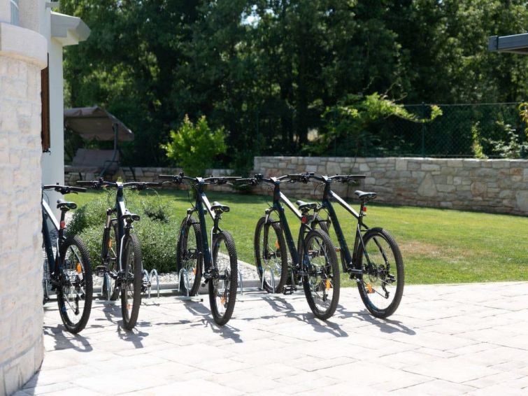 Modern, beautiful villa "San Lorenzo", 4 storeys. 500 m from the centre of Nova Vas, 3 km from the centre of Brtonigla, 8 km from the centre of Novigrad, in a sunny position, 8 km from the sea. Private: property 2'500 m2 (fenced), garden with lawn and wildlife garden, pond, swimming pool, indoor pool angular (4 x 5 m, depth 100 cm, seasonal availability: 01.Mar. - 20.Jun. and 20.Aug. - 01.Nov.) with internal staircase. Outdoor shower, hot tub, table tennis, terrace (50 m2), garden furniture, barbecue (slide, swing). In the house: internet access, sauna, fitness room, trampoline, washing machine. Available: bicycles (10). Room cleaning daily on request (extra). Cook on request (extra). Roofed, parking (for 5 cars) at the house on the premises. Shop 500 m, restaurant 600 m, bus stop 2.9 km, pebble beach 8 km. Golf course (18 hole) 25 km. Nearby attractions: Aquapark 2 km. Massage (extra) on request. Private: swimming pool angular (16 x 6 m, depth 130-150 cm, 01.03.-01.11.) with internal staircase. Available wine cellar (extra). The housekeeper comes between 8:00 and 9:00 a.m. to maintain the pond. Video surveillance of the driveway and parking.8-room villa 750 m2 on 4 levels. Spacious, comfortable and tasteful furnishings: living/dining room with open-hearth fireplace, satellite TV and air conditioning. Exit to the swimming pool. 1 room with 1 french bed (180 cm, length 200 cm), bath/bidet/WC, double hand-basin, satellite TV and air conditioning. 1 room with 1 sofabed (140 cm, length 200 cm), 1 french bed (180 cm, length 200 cm), bath/bidet/WC, double hand-basin, satellite TV and air conditioning. Exit to the swimming pool. 1 room with 1 french bed (200 cm, length 220 cm), bath/bidet/WC, double hand-basin, satellite TV and air conditioning. Exit to the swimming pool. Open kitchen (oven, dishwasher, 4 ceramic glass hob hotplates, toaster, kettle, microwave, freezer, electric coffee machine). Exit to the swimming pool. Shower/WC. On the lower ground floor: dining room with open-hearth fireplace, satellite TV and air conditioning. Open kitchen (oven, dishwasher, 4 ceramic glass hob hotplates, toaster, kettle, microwave, freezer, electric coffee machine) with air conditioning. Exit to the garden. 2 showers, sep. WC. Upper floor: (spiral staircase), 1 room with 1 french bed (200 cm, length 220 cm), bath/bidet/WC, double hand-basin, satellite TV and air conditioning. Exit to the terrace. 1 room with 1 french bed (200 cm, length 220 cm), bath/bidet/WC, double hand-basin, satellite TV and air conditioning. Exit to the garden, to the terrace. 2nd upper floor: (spiral staircase), 1 room with 1 sofabed (140 cm, length 200 cm), 1 french bed (200 cm, length 220 cm), bath/bidet/WC, double hand-basin, satellite TV and air conditioning. Forced-air heating. Terrace 10 m2, roofed terrace 20 m2, roofed. Terrace furniture, deck chairs. View of the countryside. Facilities: safe, iron, children's high chair, baby cot, hair dryer, logs (free). Internet (WiFi, free). Please note: non-smoking house. Maximum 3 pets/ dogs allowed. Fire extinguisher.