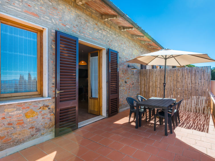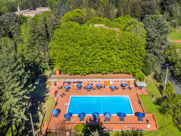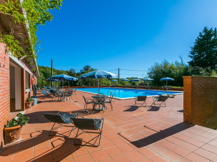 Country house "San Vivaldo", 400 m a.s.l., surrounded by trees and fields. 16 apartments in the residence. In the hamlet San Vivaldo 7 km from the centre of Montaione, 50 km from the centre of Pisa, 60 km from the centre of Firenze, in a sunny, elevated position in the residential district, 65 km from the sea, in the countryside. For shared use: property 920'000 m2, trees, swimming pool fenced (20 x 10 m, depth 150 - 250 cm, seasonal availability: 01.May. - 07.Oct. pool opening hours: 09:00-20:00) with salt-electrolysis pool-cleaning system. Shower/WC in the pool area, tennis, table tennis, terrace, garden furniture, barbecue, children's playground, pool maintenance by the owner/gardener. In the complex: reception, WiFi, washing machine (for shared use). Roofed, parking on the premises. Grocery, restaurant, bar, bakery 10 m, bus stop 7 km, sandy beach "Cecina Mare" 66 km. Golf course (18 hole) 4 km. Nearby attractions: San Gimignano 17 km, Certaldo 19 km, Volterra 30 km. Please note: car recommended. Baby equipment (included). Local sale of farm products. All houses/apartments are individually designed/furnished. Public E-charging station ca. 100 m."San Vivaldo, Nr. 11", 2-room apartment 50 m2 on 1st floor. Practical and rustic furnishings: living/sleeping room with 1 double sofabed, dining table and satellite TV. Exit to the terrace. 1 room with 1 double bed. Kitchenette (mini-oven, dishwasher, 4 induction hot plates, toaster, kettle, electric coffee machine). Shower/bidet/WC. No heating option. Terrace. Terrace furniture. Panoramic view. Facilities: children's high chair, baby cot. Internet (WiFi, free). Please note: non-smokers only. Maximum 2 pets/ dogs allowed. IT053025C28GWESZXY
