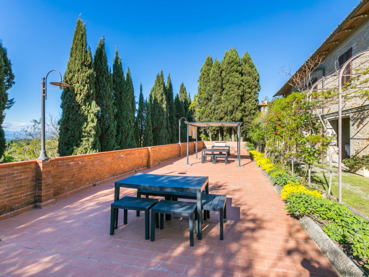 Country house "San Vivaldo", 400 m a.s.l., surrounded by trees and fields. 16 apartments in the residence. In the hamlet San Vivaldo 7 km from the centre of Montaione, 50 km from the centre of Pisa, 60 km from the centre of Firenze, in a sunny, elevated position in the residential district, 65 km from the sea, in the countryside. For shared use: property 920'000 m2, trees, swimming pool fenced (20 x 10 m, depth 150 - 250 cm, seasonal availability: 01.May. - 07.Oct. pool opening hours: 09:00-20:00) with salt-electrolysis pool-cleaning system. Shower/WC in the pool area, tennis, table tennis, terrace, garden furniture, barbecue, children's playground, pool maintenance by the owner/gardener. In the complex: reception, WiFi, washing machine (for shared use). Roofed, parking on the premises. Grocery, restaurant, bar, bakery 10 m, bus stop 7 km, sandy beach "Cecina Mare" 66 km. Golf course (18 hole) 4 km. Nearby attractions: San Gimignano 17 km, Certaldo 19 km, Volterra 30 km. Please note: car recommended. Baby equipment (included). Local sale of farm products. All houses/apartments are individually designed/furnished. Public E-charging station ca. 100 m."San Vivaldo, Nr. 10", 3-room apartment 55 m2 on 1st floor. Practical and rustic furnishings: 1 double bedroom. 1 room with 2 beds (80 cm). Kitchen-/living room (dishwasher, 4 induction hot plates, toaster, kettle, microwave, electric coffee machine) with dining table, satellite TV. Exit to the terrace. Bath/bidet/WC. No heating option. Natural stone floors. Terrace. Terrace furniture, barbecue. Very beautiful panoramic view of the countryside. Facilities: children's high chair, baby cot for up to 2 year olds. Internet (WiFi, free). Parking (roofed, 1 car) at the house. Please note: non-smokers only. Maximum 2 pets/ dogs allowed. IT048027B5E8F968IQ