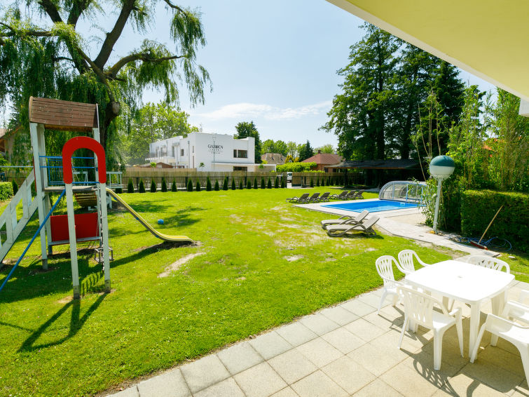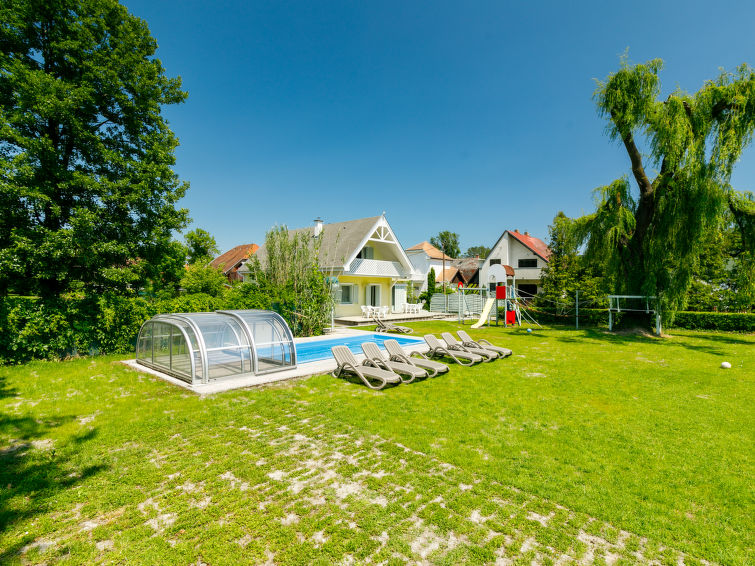 Balatonmáriafürdő 18 km from Keszthely: Child friendly, beautiful 2-family house "Sapphire", 2 storeys. In the resort, 100 m from the centre, 250 m from the lake, 200 m from the beach. Private: property 1'200 m2 (fenced), garden with lawn and flowers, swimming pool angular (6 x 4 m, depth 140 cm, seasonal availability: 15.May. - 15.Sep.). Children's playground. In the house: WiFi (all included), air conditioning (extra). Grocery 200 m, supermarket 9 km, restaurant 80 m, bakery, café, railway station 300 m, grass beach 150 m, thermal baths "Csiszta" 15 km. Surf school 7 km, sailing school 1 km, tennis 400 m, riding stable 4 km, cycle lane 50 m, children's playground 350 m, fishing possibilities 150 m. Nearby attractions: Héviz Thermal Bath 20 km, Festetics Palace 19 km, Rubin Winery 1.5 km, Airport 1.8 km, Hamvas Béla viewpoint 3 km.7-room house 170 m2 on 2 levels. Partly with sloping ceilings, comfortable furnishings: living/dining room with satellite TV. Exit to the terrace. 2 rooms, each room with 1 french bed and shower/WC. 1 room with 1 double bed. Open kitchen (4 hot plates, oven, dishwasher, microwave). Sep. WC. Heating. Upper floor: small living room. 2 double bedrooms, each room with shower/WC. Exit to the balcony. 1 room with 1 french bed and separate WC. Terrace furniture, balcony furniture, barbecue. Facilities: washing machine. Parking (fenced 3 cars). EG19022868
