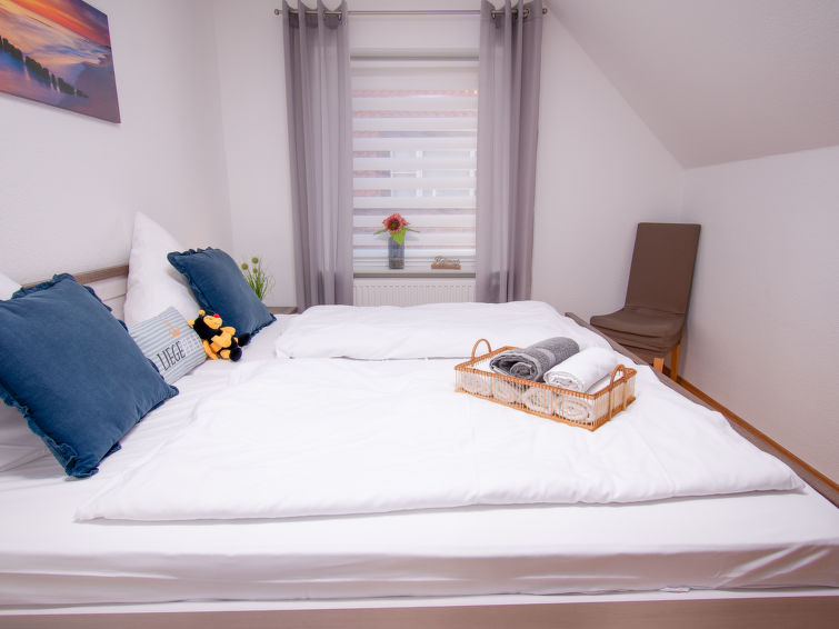 Apartment house. In the centre, 1 km from the sea, 1 km from the beach. In the house: central heating system. Parking at the house. Supermarket 500 m, restaurant 10 m, bakery 250 m, café, bus stop 200 m, railway station "Norddeich" 1 km, ferry 1 km, sandy beach 1 km, outdoor swimming pool 14 km, indoor swimming pool 800 m. Golf course (18 hole) 8 km, surf school 1 km, tennis 2.5 km, children's playground 800 m."Seegras", 4-room apartment 74 m2 on 2 levels on 1st floor. Spacious, partly with sloping ceilings, comfortable and modern furnishings: living/dining room 32 m2 with satellite TV (flat screen), radio, DVD and DVD collection available. Exit to the balcony. 1 room 10 m2 with 1 double bed (2 x 90 cm, length 200 cm). Kitchenette (oven, dishwasher, 4 ceramic glass hob hotplates, toaster, kettle, microwave, freezer, electric coffee machine, Capsules for coffee machine (Senseo) extra). Shower/WC. Underfloor heating. Top floor: 1 room 6 m2 with 1 bed and satellite TV (flat screen). 1 room 6 m2 with 1 bed. Sep. WC. Balcony furniture. Facilities: washing machine, iron, children's high chair, hair dryer. Internet (WiFi, free). Please note: non-smokers only. Smoke alarm. Sockets for e-bikes available in the garden shed. TV is a SMART TV.