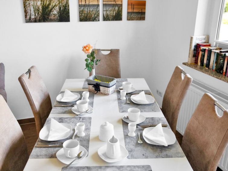 Warwerort 4 km from Büsum: Modern apartment block. In the resort Warwerort, 4 km from the centre of Büsum, in a quiet position, from the sea, 600 m from the beach. For shared use: natural garden 500 m2. In the complex: central heating system. Parking at the house, public parking 100 m. Shop 2.5 km, grocery 2.5 km, supermarket 2.5 km, restaurant 600 m, bakery 2.5 km, café 1.5 km, bus stop 400 m, grass beach 600 m, indoor swimming pool 4 km, public bathing area 600 m, lake Surfsee 2.5 km. Golf course (18 hole) 700 m. Please note: car recommended. The apartment building with a total of 24 apartments and an additional, directly attached holiday home is located outside the area of Warwerort where tourist tax is payable."Seeschwalbe", 3-room apartment 80 m2 on 1st floor. Cosy furnishings: living/dining room 28 m2 with 1 double sofabed (160 cm, length 200 cm), satellite TV (flat screen), CD-player and hi-fi system. Exit to the balcony. 1 room 14 m2 with 1 double bed (180 cm, length 200 cm). 1 room 12 m2 with 1 double bed (180 cm, length 200 cm). Exit to the balcony. Kitchen 8 m2 (oven, dishwasher, 4 ceramic glass hob hotplates, electric coffee machine) with small dining table. Bath/shower/WC. Small balcony 7 m2, large terrace 16 m2. Terrace furniture, balcony furniture, deck chairs (2). Facilities: Internet (WiFi, free). Please note: non-smokers only. Maximum 1 pet/ dog allowed. Smoke alarm, fire extinguisher. The balcony is covered. The second terrace offers direct sunlight all day long. Bicycle storage room (for shared use) on the property.