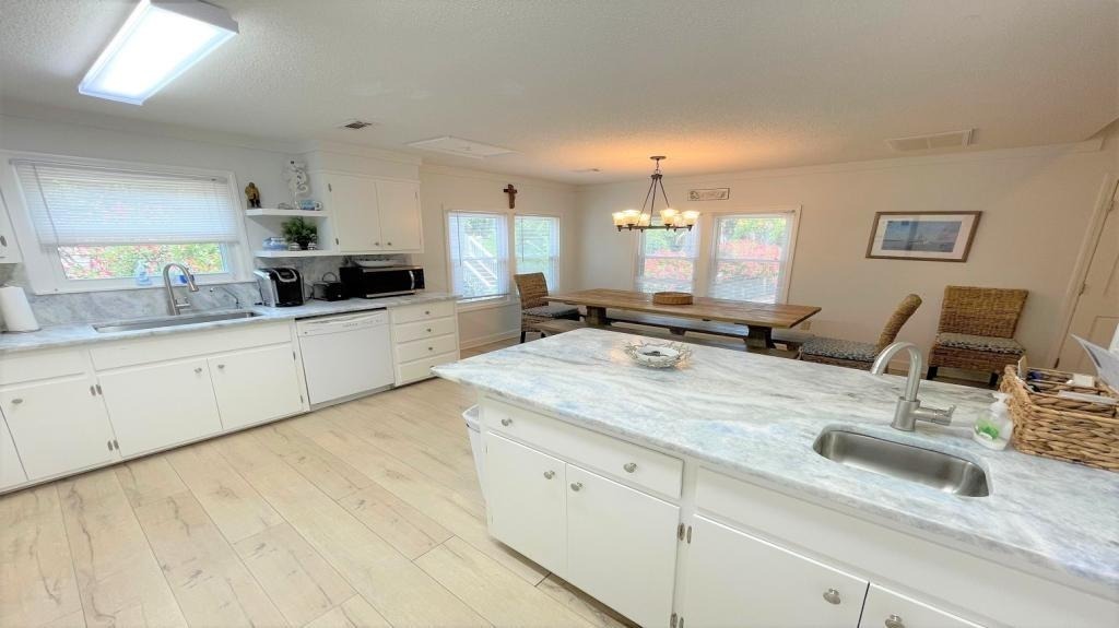 5BR/4BA (Sleeps 14- 4Q, 2D, 1SS) Check out this coastal gem! Just steps from the beach with a heated (for a fee) swimming pool, ocean views, spacious living areas-all nestled on a beautiful lot with Palm and Live Oak trees. Enter the main house into the living, dining and kitchen combination area. This house is beautifully decorated with coastal accents and cool colors reminiscent of the sea. The well-equipped, spacious kitchen is open with bar seating for two and a wet bar. This property features 2 full kitchens which helps with feeding a crowd. The dining area seats 8 and is filled with lots of natural light. The living area provides a relaxing area for curling up with a good book or visiting with family and friends. A large den is off the living area with views of the ocean, TV, board games, puzzles and additional dining for 3-5. Washer/Dryer is in the den closet. A sun deck is located off the den and overlooks the pool and offers ocean views with seating. Two bedrooms are located on the main floor: Bedroom 1 has a Queen Bed with a private door to the sundeck. Bedroom 2 is the Master Bedroom with Queen Bed, TV and bathroom with tub/shower. The Hallway bathroom has a molded shower with seating and a connected vanity sink area. The Upstairs loft has a spacious bedroom with Ocean views, two Double Beds, Foosball table, and connecting bathroom with tub/shower. The attached private cottage is charming! Enter through a quaint Screened porch with Vintage wicker chairs & table. Included in the cottage suite is an open living area (TV) with kitchen and dining. Upstairs: two bedrooms both with a Queen Bed and a hallway bathroom with walk-in shower.
