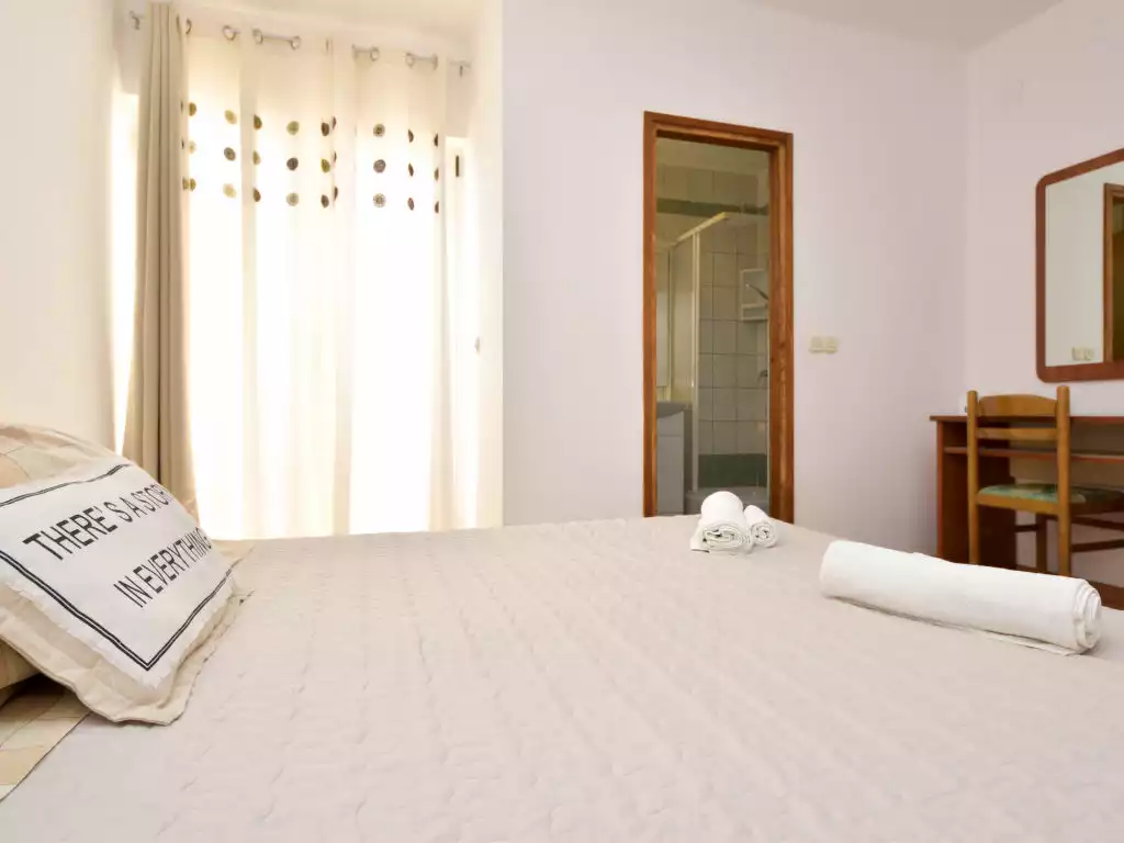 Apartment house "Silvija". In the resort, in a sunny position, 60 m from the sea, 60 m from the beach. For shared use: property 300 m2. Barbecue. In the house: internet access. Parking at the house on the premises. Shop, restaurant 100 m, bus stop 2.5 km, pebble beach, concrete beach 60 m. Please note: Additional accommodations can be booked.2-room apartment 40 m2 on 1st floor. Living/dining room 16 m2 with 1 double sofabed (160 cm, length 200 cm), satellite TV (flat screen), air conditioning. Exit to the balcony. 1 room with 1 double bed (2 x 80 cm, length 200 cm), shower/WC. Exit to the balcony. Open kitchen (2 hot plates, kettle, microwave). No heating option. Balcony 3 m2, small balcony. Balcony furniture. View of the sea. Facilities: Internet (WiFi, free).
