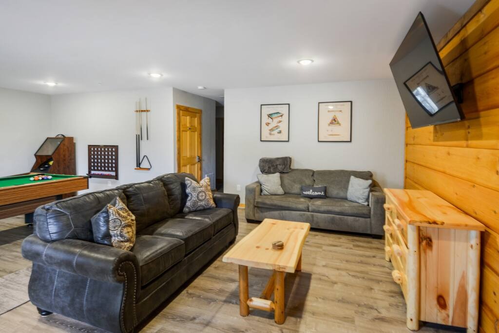 Additional sleeping areas can be found in the front sitting room and the lower-level game room, both of which are equipped with queen sleeper sofas.