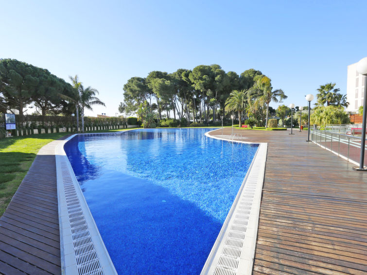 Very modern, beautiful resort "Sol Cambrils Park". In the resort, in a quiet, sunny position, 30 m from the sea, 30 m from the beach, road to cross. For shared use: property 10'000 m2 (fenced), large, beautiful, well-kept garden with lawn, swimming pool, indoor pool heated (22 x 65 m, depth 60 - 220 cm, seasonal availability: 01.Jan. - 31.Dec. pool opening hours: 10:00-23:00). Children's pool, outdoor shower. In the house: sauna, fitness room, hot tub, lift. Shop, grocery, supermarket 600 m, shopping centre 12 km, restaurant, bar 200 m, bakery 600 m, café 200 m, bicycle rental 300 m, pub garden 200 m, bus stop "Playa Cavet" 240 m. Sports harbour 3 km, marina 3 km, golf course (18 hole) 6 km, surf school 500 m, sailing school 3 km, riding stable 8 km. Nearby attractions: Port Aventura 8 km, Aquopolis 9 km, Aquum Spa 9 km. Hiking paths: La Mussara 35 km. The owner does not accept any youth groups. Please note: Property ref. ES9582.600.6 is situated on the same property. Neighbourhood highly sensitive to noise. Quietness and good behaviour expected. The grounds have a sports court, suitable for football and basketball, 2 small tennis courts and a beach-volleyball court. Use of these courts is included in the rent."Sol Cambrils Park Bajos", 4-room apartment 68 m2, lower ground floor. Modern and tasteful furnishings: living/dining room with TV (flat screen), electric shutters. 1 room with 1 french bed and bath/bidet/WC. 2 rooms, each room with 2 beds. Small, open kitchen (oven, dishwasher, 4 ceramic glass hob hotplates, microwave, electric coffee machine, Capsules for coffee machine (Nespresso)) with dining table and TV (flat screen), electric shutters. Exit to the loggia. Bath/WC. Air-conditioning. Heating not available in all rooms. Terrace. Terrace furniture. Side view of the swimming pool. Facilities: washing machine. Internet (WiFi, free). Parking space n 36 (roofed). Suitable for families. HUTT008126 // Reg. Nr.: ESFCTU00004303100040833100000000000000000HUTT-0081263