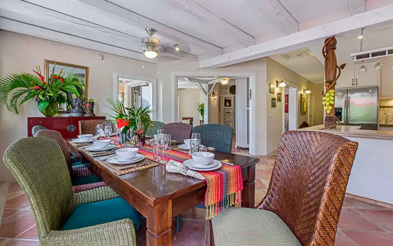 The living area is elegantly furnished with with a Caribbean flair and has a flat screen TV offering Cable TV service. Indoor dining area for up to 8 persons.