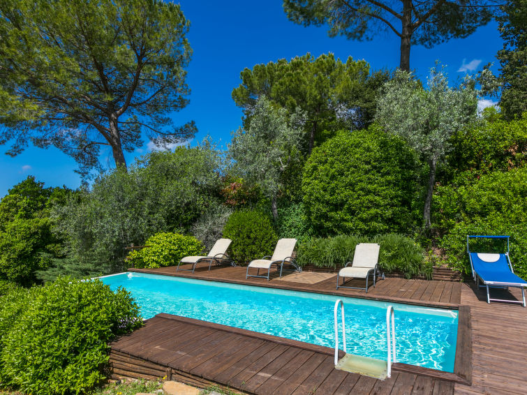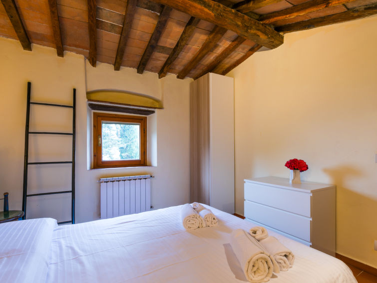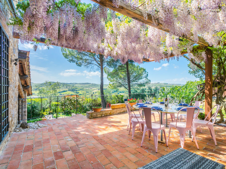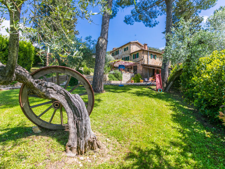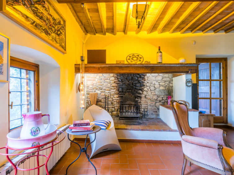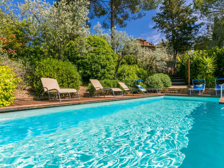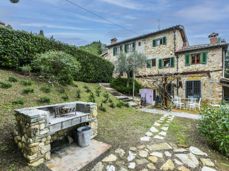 S.Casciano Val di Pesa: Large, cosy farmhouse "Sole", 3 storeys, renovated in 2019, surrounded by trees and vineyards. 2.5 km from the centre of San Scasciano, in a secluded, sunny position on a slope, 90 km from the sea, in the countryside. Private: property 600 m2 (fenced), terraced garden with wildlife garden and trees, swimming pool (above ground) (3 x 8 m, seasonal availability: 10.May. - 10.Oct.). Outdoor shower, terrace, garden furniture, barbecue, pool maintenance by the owner/gardener. In the house: washing machine. Linen change (suppl. charge extra). Towel change (suppl. charge extra). Cook on request (extra). Pre-arrival grocery service. 800 m long bumpy, narrow motor access to the house. Parking (for 4 cars) at the house on the premises. Shop 2 km, grocery 2 km, supermarket 2 km, restaurant 2 km, bakery 2 km, bicycle rental 2 km, bus stop "San Casciano" 2 km, railway station "Firenze Santa Maria Novella" 22 km, sandy beach 90 km, indoor swimming pool 4 km. Golf course (18 hole) 21 km, tennis 4 km, walking paths from the house 100 m. Nearby attractions: Firenze 22 km, San Gimignano 40 km, Siena 60 km, Pisa 74 km. Please note: car recommended. Baby equipment (included). Groups of teenagers on request only. Local sale of farm products." Sole", 6-room farmhouse 195 m2 on 3 levels. Spacious, fully renovated in 2019, tasteful and cosy furnishings: open living room with open-hearth fireplace and TV (flat screen). Exit to the terrace. Dining room. Kitchen (oven, dishwasher, Gas stove, 5 gas rings, toaster, kettle, microwave, electric coffee machine). On the lower ground floor: 1 double bedroom. Exit to the garden. Shower/WC. Upper floor: 2 double bedrooms, each room with air conditioning. 1 double bedroom with 1 bed (140 cm), air conditioning. Shower/bidet/WC, bath/shower/bidet/WC. Heating (extra), air-conditioning. Natural stone floors. Terrace, large terrace roofed, patio. Terrace furniture, barbecue, deck chairs, covered balcony, box-room. Very beautiful panoramic view of the countryside. Facilities: washing machine, iron, mosquito net, children's high chair, baby cot for up to 2 year olds, hair dryer. Internet (WiFi, free). Parking (fenced) at the house. Please note: non-smokers only. Private entrance. The pool mentioned in the description is for private use. IT048038C24Q4Q8KAO
