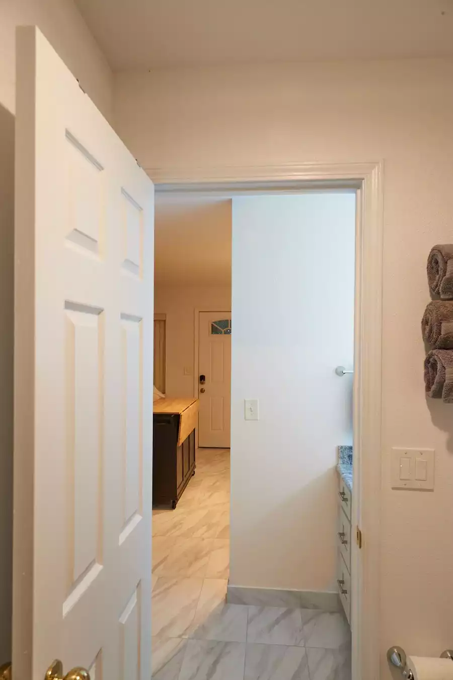 New porcelain tiled bath/shower. Full towel sets, individually packaged shampoo, soaps, toothpaste, toothbrushes, more.