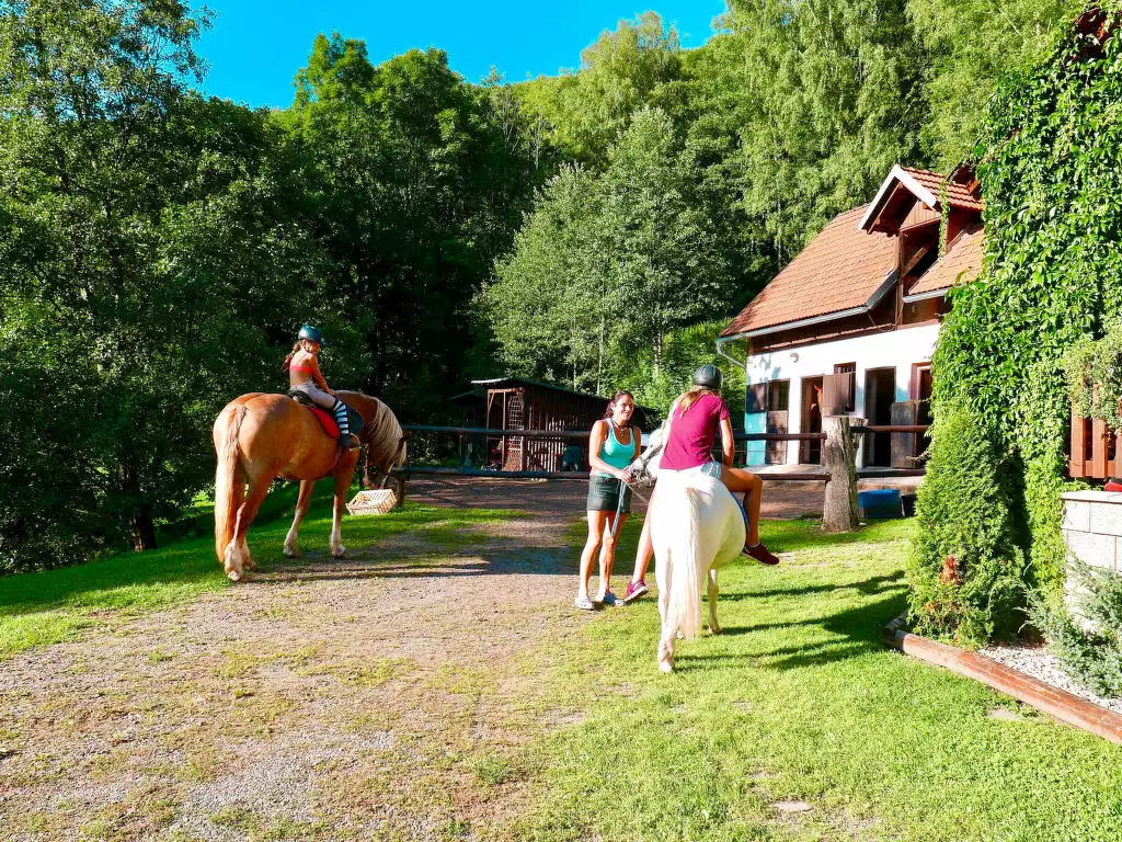 Stárkov 18 km from Náchod: Resort "Stárkov", 450 m a.s.l., built in 1997, surrounded by meadows. 22 houses in the resort. On the outskirts, in a sunny, elevated position on a slope, along the wooded area, 24 km from the lake, 10 km from the skiing area, in the countryside. For shared use: property 10 ha, meadow, pond, swimming pool (8 x 4 m, depth 150 cm, seasonal availability: 15.Jun. - 16.Sep.). Table tennis, volleyball, badminton, volleyball court, beach volleyball, patio, barbecue, fireplace, children's playground (slide, swing, sandbox). In the complex: reception, lounge, bistro, massage (extra). Billiard table, table football, trampoline, kiosk, storage room for bicycles, laundry (extra). Linen change (suppl. charge extra). Towel change (suppl. charge extra). Room cleaning on request (extra). Bread roll service possible on request. Pre-arrival grocery service. Motor access to 200 m from the house. Central parking spaces. Grocery 1 km, supermarket 8 km, restaurant 1 km, café 10 m, bus stop "Stárkov, mlékárna" 50 m, railway station "Hronov" 8 km, indoor swimming pool 18 km. Golf course (9 hole) 26 km, sailing school 26 km, tennis 500 m, riding stable, walking paths from the house, cycle lane 10 m, ski lift 6 km, ski school 17 km, cross country ski track 100 m, ice rink 8 km, children's playground 10 m. Nearby attractions: Adršpašsko-teplické skály 15 km, Náchod 17 km, Broumovské stěny 17 km, Ratibořice a Babiččino údolí 22 km, Broumov 24 km, Relaxpark Pec pod Sněžkou 50 km. Well-known ski regions can easily be reached: Radvanice 10 km, Petříkovice 17 km, Mladé Buky 36 km. Well-known lakes can easily be reached: vodní nádrž Rozkoš 26 km. Please note: suitable for families, baby equipment on request (included). Loading and unloading of baggage is possible at the holiday house. The photograph shows a typical example. All houses/apartments are individually designed/furnished.4-room house 100 m2 on 2 levels. Bright, cosy furnishings: living room with satellite TV and flat screen. Exit to the terrace. Open kitchen (4 hot plates, toaster, kettle, microwave, freezer, electric coffee machine) with dining table. Sep. WC, bath or shower/WC. Electric heating. Upper floor: 1 room with 2 beds. 1 room with 2 beds. 1 room with 1 double bed. Terrace 11 m2. Terrace furniture. Beautiful panoramic view of the valley and the countryside. Facilities: iron, children's high chair, baby cot (extra). Internet (WiFi, extra). Please note: suitable for families. Non-smoking house. Maximum 2 pets/ dogs allowed.