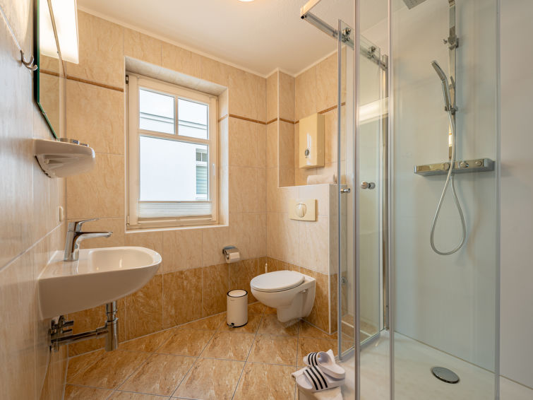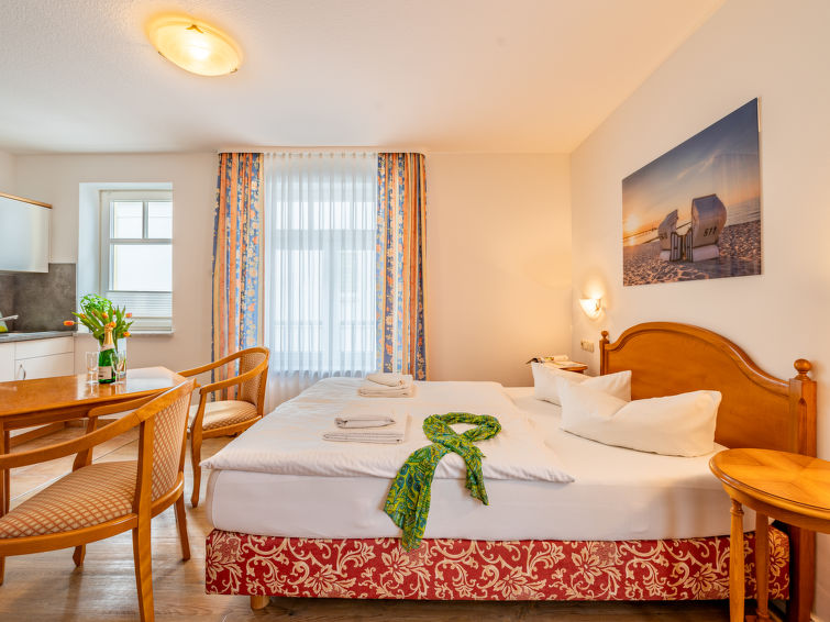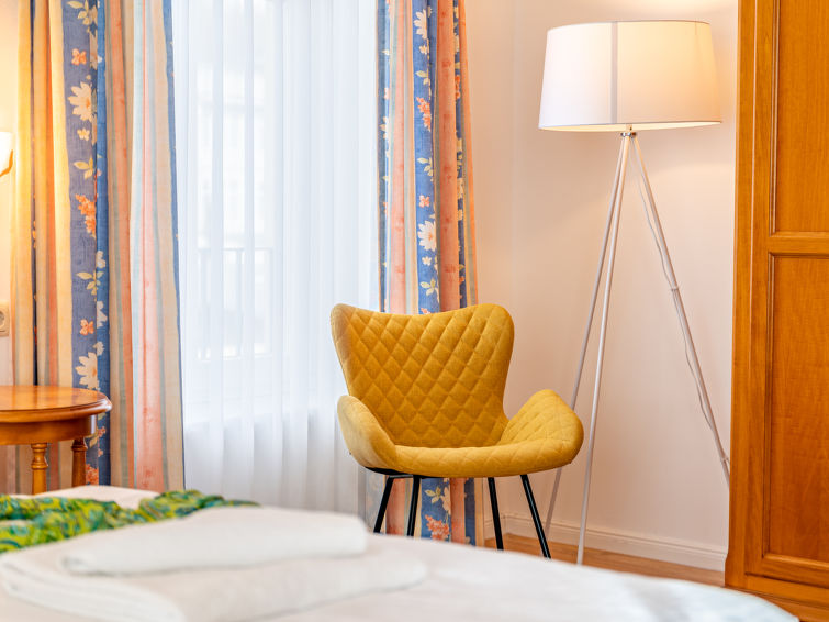 Beautiful, historical villa "Stolzenfels", 3 storeys, renovated in 2024. 12 apartments in the residence. In the centre 300 m from the centre of Sellin, 6 km from the centre of Göhren, 12 km from the centre of Binz, residential area (villas), 500 m from the sea. For shared use: property 800 m2. Terrace (12 m2), garden furniture, barbecue. In the house: lift. Breakfast possible (extra). Parking (extra) on the premises. Parking space or garage only for small to medium-sized cars. Supermarket 500 m, bakery, café 600 m, 5 minute walk to the centre, bus stop 100 m, sandy beach 500 m, indoor swimming pool 600 m. Nearby attractions: Seebrücke 900 m. Water park 'RÜGEN AHOI!' with pirate ship as super fun for the kids, outdoor pool, sauna area, sunbathing lawn and beach volleyball court approx. 600 m. Covered bicycle parking available.1-room apartment 26 m2. Beautiful and tasteful furnishings: living/sleeping room with 1 french bed (140 cm, length 200 cm), satellite TV. Open kitchen (2 ceramic glass hob hotplates, kettle, microwave, electric coffee machine) with dining nook. Shower/WC. Gas heating. Facilities: baby cot (extra). Internet (WiFi, free). Parking (extra, 1 car). Please note: non-smokers only. Maximum 1 pet/ dog allowed. Smoke alarm, fire extinguisher. New showers and new, very quiet refrigerators in all apartments.