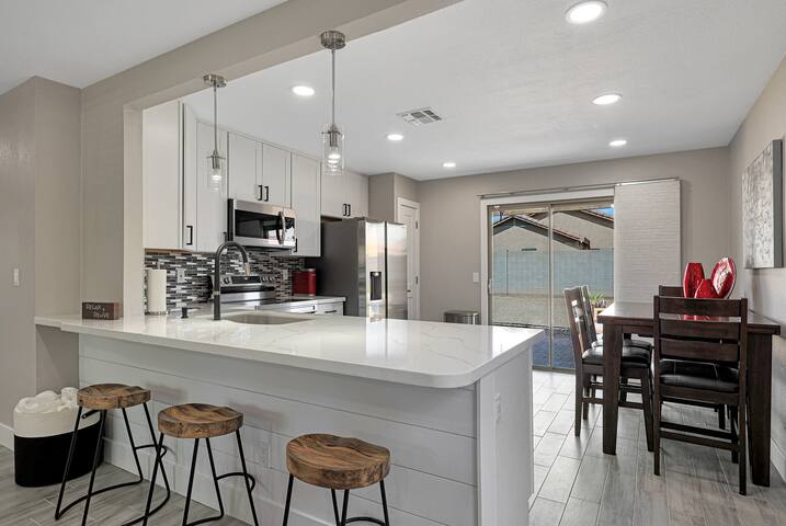 Stay in style in Surprise! This updated modern home has been fully renovated and is perfect for your stay. Whether you are in town to watch a Spring Training game, Cardinals football game, or here to visit family and friends, this home has everything you need. The dedicated office space, comfortable living room, three bedrooms featuring Smart TVs, two bathrooms, fully stocked kitchen, and a backyard featuring a great seating area, grill and fire pit, this home will not disappoint.
