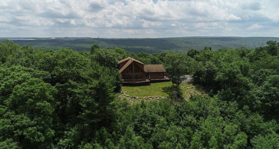 This modern chalet log-cabin rests high atop the mountain on 4 acres of serenity in Sugarloaf PA. The magnificent view overlooks the Conyngham valley and is ever changing. The 3 bedroom 3 bath open floor plan showcases the breathtaking view from almost every room in the house. Sugarloaf Summit is great for vacations any time of year. Kick back on the adirondack chairs and feel the rush of fresh mountain air completely relax you. Plenty of wildlife such as wild turkey, deer, porcupines and even the occasional black bear can be spotted. The 8 person salt water hot tub keeps the party going at all times of year. Central AC and individually zoned radiant floor heating make for an extremely comfortable space. A gas fireplace, 70" living room TV and concert level surround sound stereo system check all the boxes for 'over-the-top' accomodations you should expect out of any vacation home. The kitchen is fully stocked with cooking gadgets, huge center island for congregating and top of the line pots, pans and bakeware. Guest linens and towels are provided.
