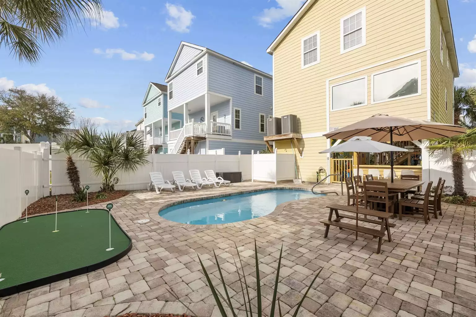 The outdoor entertainment area includes a 5' deep, private saltwater pool, an 8-seat table with large umbrella, a kids picnic table, 4 comfortable lounge chairs, a putting green and an outdoor shower.