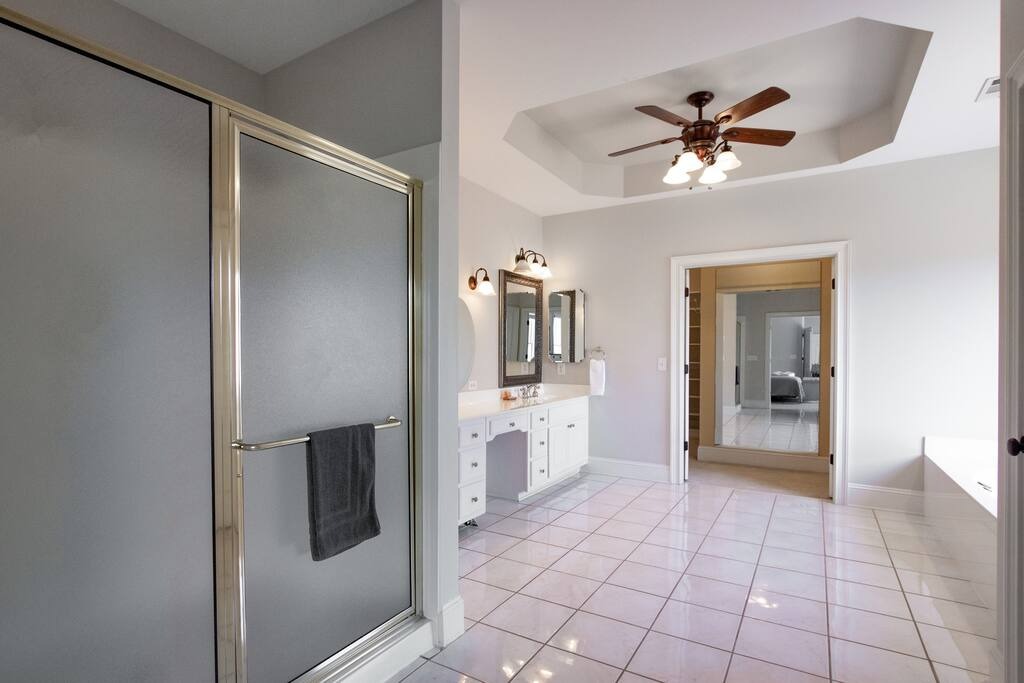 The main bedroom is on the top floor and has a king-size bed, two single beds, and an en-suite bathroom. There are three other bedrooms on this floor as well, two have king beds and en-suite bathrooms, and one has two bunk beds (four twin beds) and shares the en-suite bathroom with one of the other rooms. The basement level has two more bedrooms with king beds that share a large Jack and Jill bathroom. One of these rooms also has a queen over twin bunk bed. There is also a full bathroom off the basement living room and a cabana bathroom (with shower) by the pool. All bedrooms are on the top floor or basement level. There are no bedrooms on the main level.